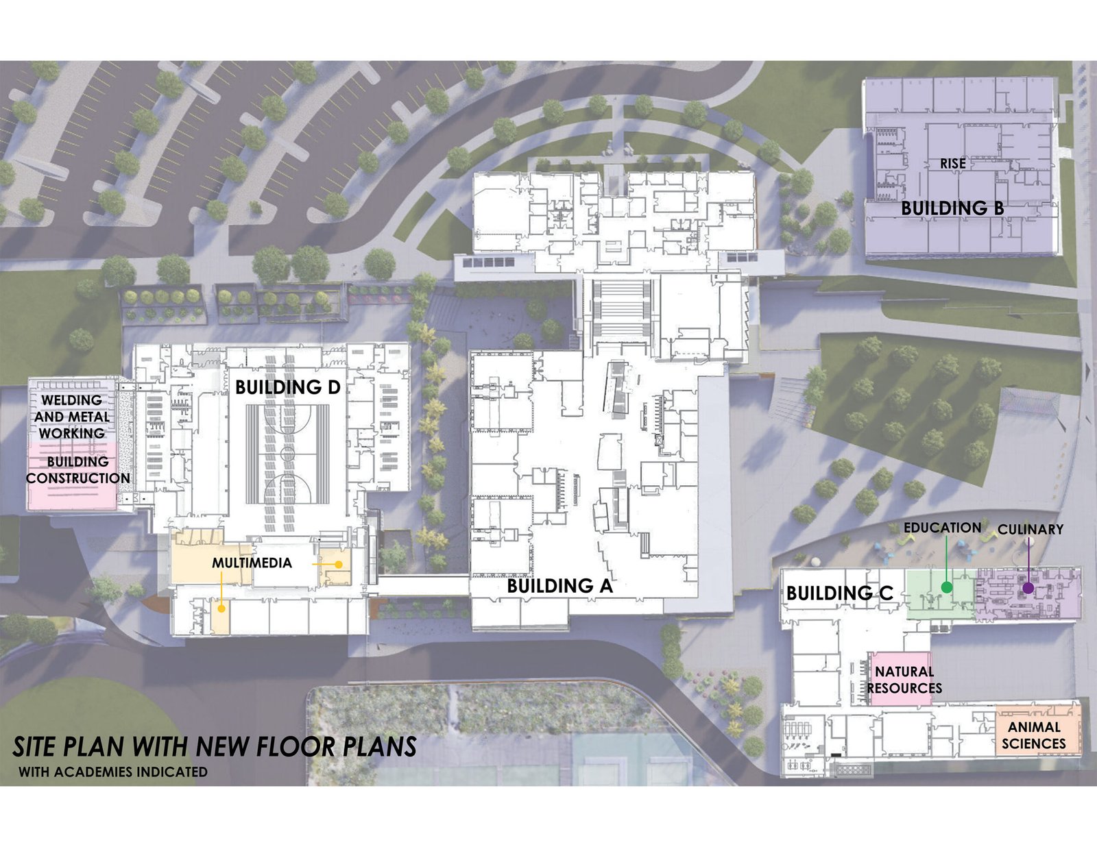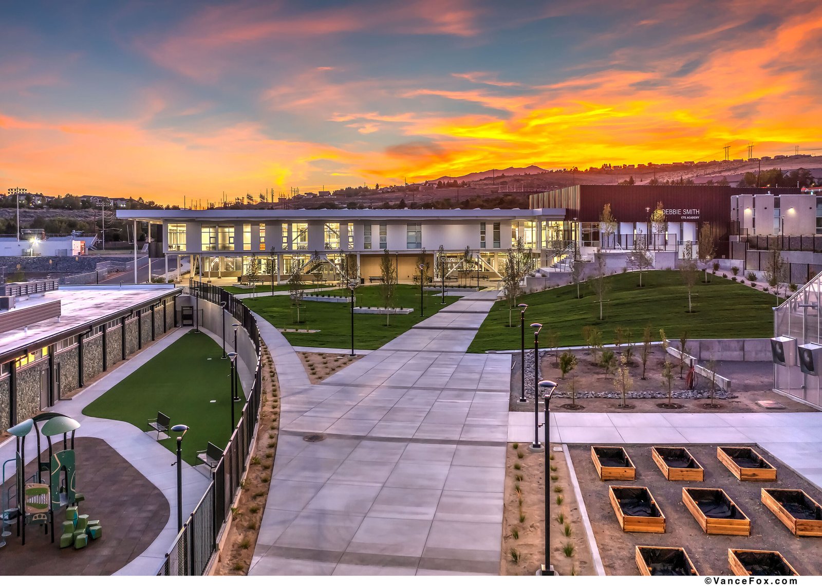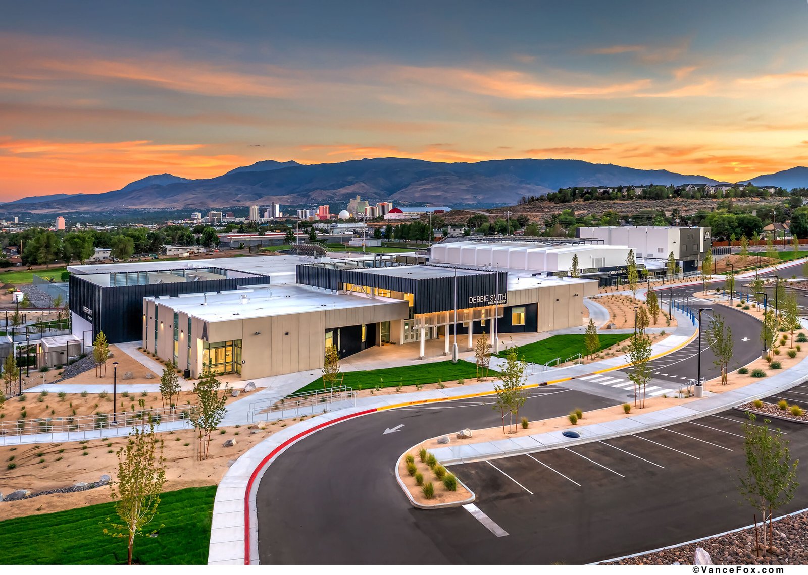 The Debbie Smith Career and Technical Education Academy transforms an aging campus of 8 buildings into a cohesive new campus for a new generation of learning. Designed for the Washoe County School District, the 224,000-square-foot campus merges 121,000 square feet of adaptive reuse with 103,000 square feet of new construction, uniting past and future within a single, legible framework. The Owner determined that only 5 of the 8 individual existing buildings would be demolished. With that, the design addresses a 40’ differential in site slope from single point entrance to sport fields while also acting as a connector between the remaining (3) existing buildings. This provides the “Connective” element for the new collaborative education environment for this Technical academy. A new two-story academic building anchors the 37-acre site, linking existing structures through plazas, terraces, and covered outdoor spaces that invite collaboration and connection. The architecture expresses the school’s mission — to elevate hands-on learning — through transparency, exposure, and authenticity. Programs ranging from Biomedicine to Construction, from Culinary Arts to Digital Media, are brought into visual dialogue, celebrating the breadth of human skill. Here, structure and spirit align: daylight reveals process, materials speak of craft, and every space teaches through its making.