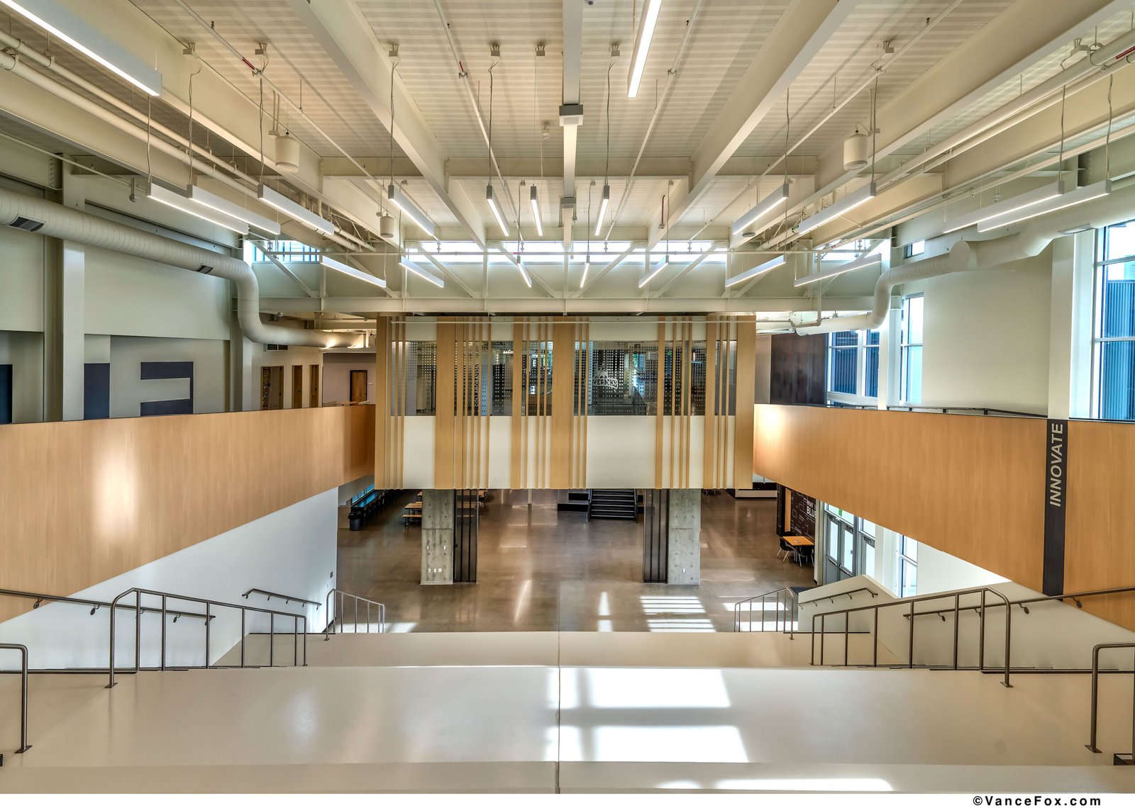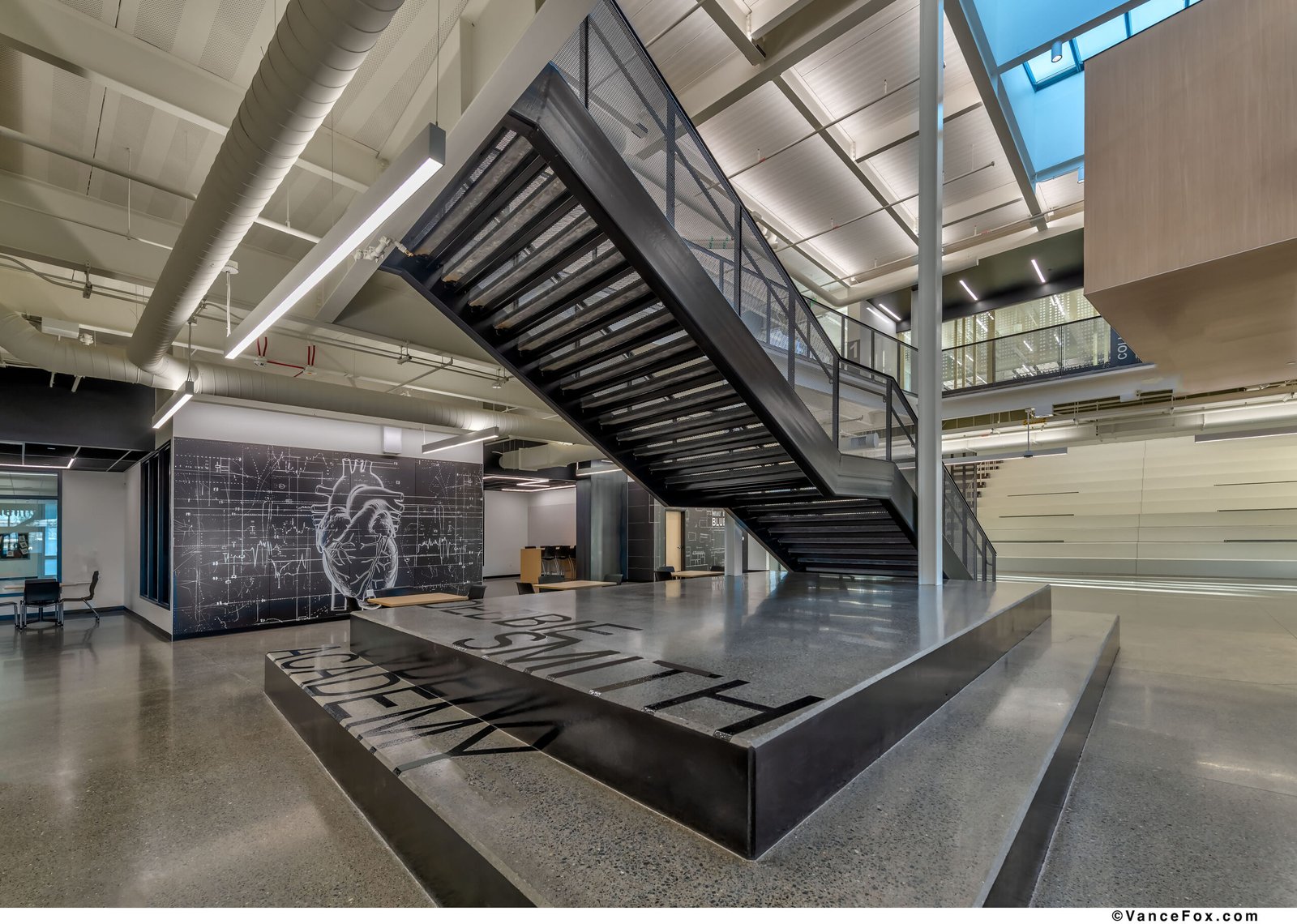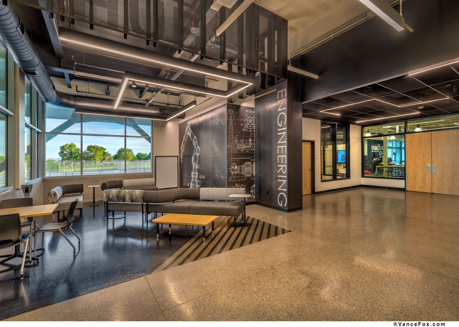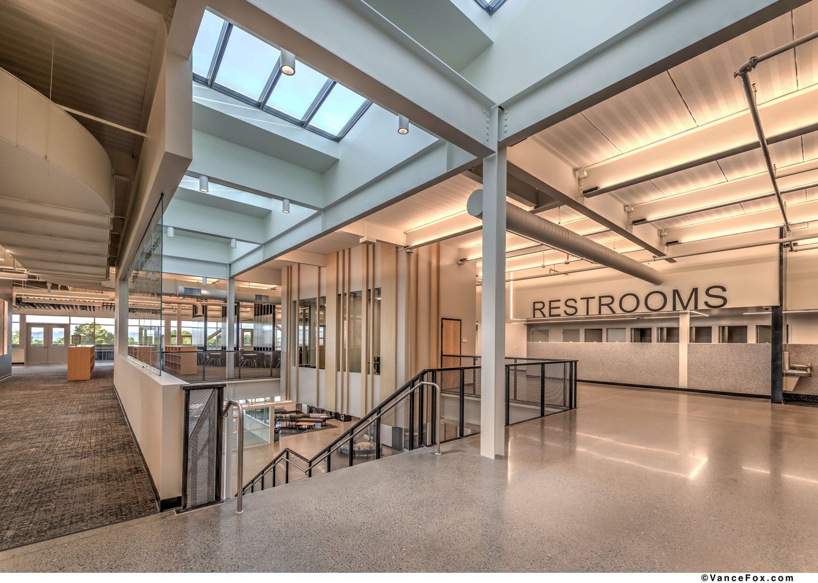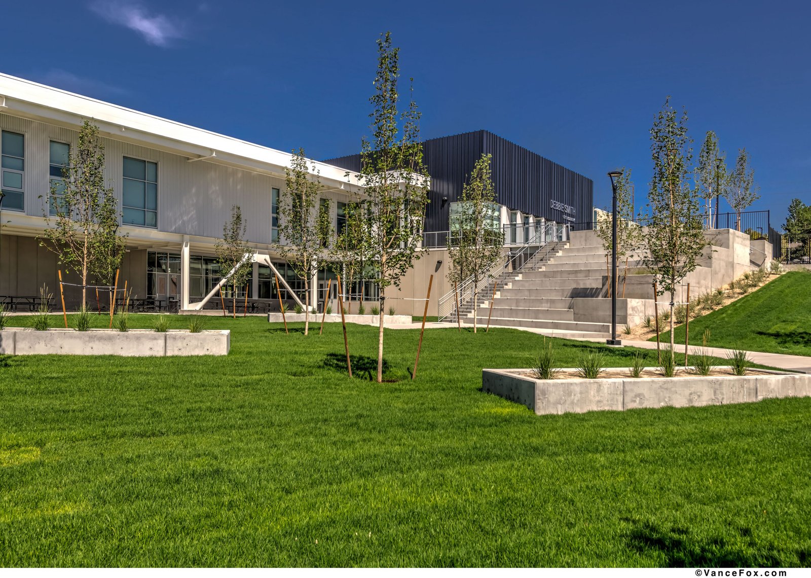 Set against Reno’s foothills, the Debbie Smith Career and Technical Education Academy establishes a new model for learning environments where industry, artistry, and community converge. The project transforms a disjointed mid-century campus into a unified academic village that frames education as both collaboration and civic act. A two-story academic building anchors the site, organizing the campus around a central commons and terraced green. This composition reconciles topography and circulation, stitching new and existing buildings together through plazas, outdoor classrooms, and shaded walkways. The resulting sequence of spaces encourages movement, gathering, and the exchange of ideas — indoors and out. The architectural language is purposeful and direct. Exposed structure, robust materials, and visible systems embody the honesty of craft. The “Pitch Pit,” a monumental stair within the commons, becomes the social heart — a forum for daily interaction, presentations, and shared experience. Daylight and transparency animate interior bridges and labs, revealing the act of making and celebrating curiosity as a collective pursuit. Material continuity binds old and new. Black metal panels, polished concrete, and warm wood accents extend across the campus, aligning durability with identity. The palette echoes the school’s colors — black, white, silver, and gold — and reframes utilitarian forms into school pride expression. Programmatically, the design supports an exceptional range of disciplines: from Nursing and Robotics to Agriculture, Welding, Culinary Arts, and Media Production. Each is expressed architecturally through specialized labs, integrated graphics, and visual openness that encourage cross-disciplinary engagement. The building becomes a living diagram of learning — where structure, systems, and signage together form a curriculum of space. The design’s planning framework reflects an educational philosophy centered on visibility, inclusivity, and shared purpose. Circulation zones double as social corridors, connecting diverse programs and encouraging interdisciplinary discovery. Transparency is used not as a gesture, but as a pedagogical tool — transforming corridors into galleries of process, where students witness one another’s work across disciplines. The building’s modular structural grid and rational organization allow for future adaptation, enabling the facility to evolve alongside emerging technologies and industries. In this way, the architecture becomes both a vessel for learning and a resilient infrastructure for the district’s long-term educational vision. Sustainability is inseparable from strategy. Over half the campus was retained and repurposed, conserving embodied carbon while focusing resources on transformative new construction. The design process enabled iterative collaboration with educators, ensuring that spatial planning, technical performance, and educational vision evolved together. In composition and intent, the Debbie Smith CTE Academy redefines what a public school can be: a place where architecture teaches resilience, where making is visible, and the built environment itself becomes an agent of pride and possibility.