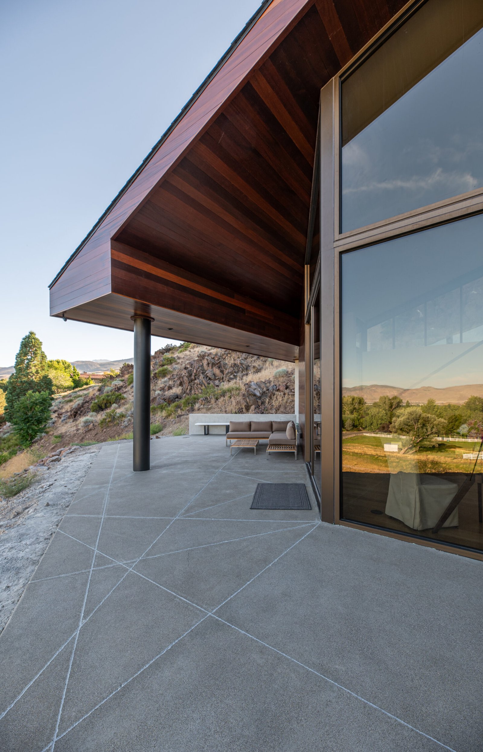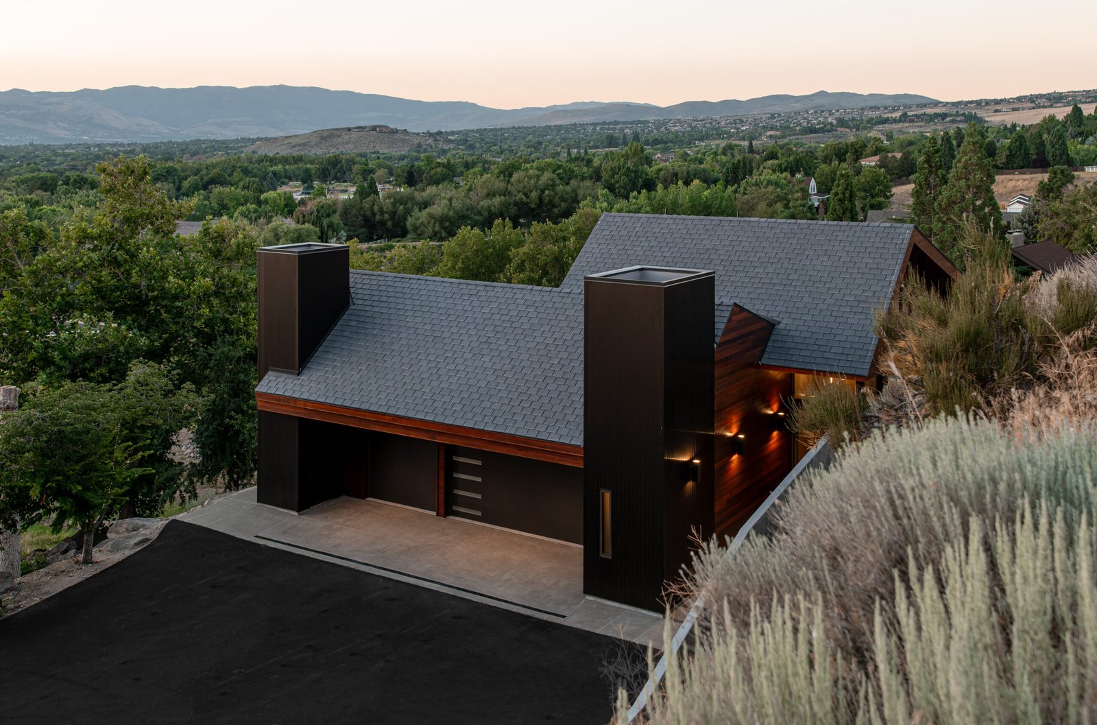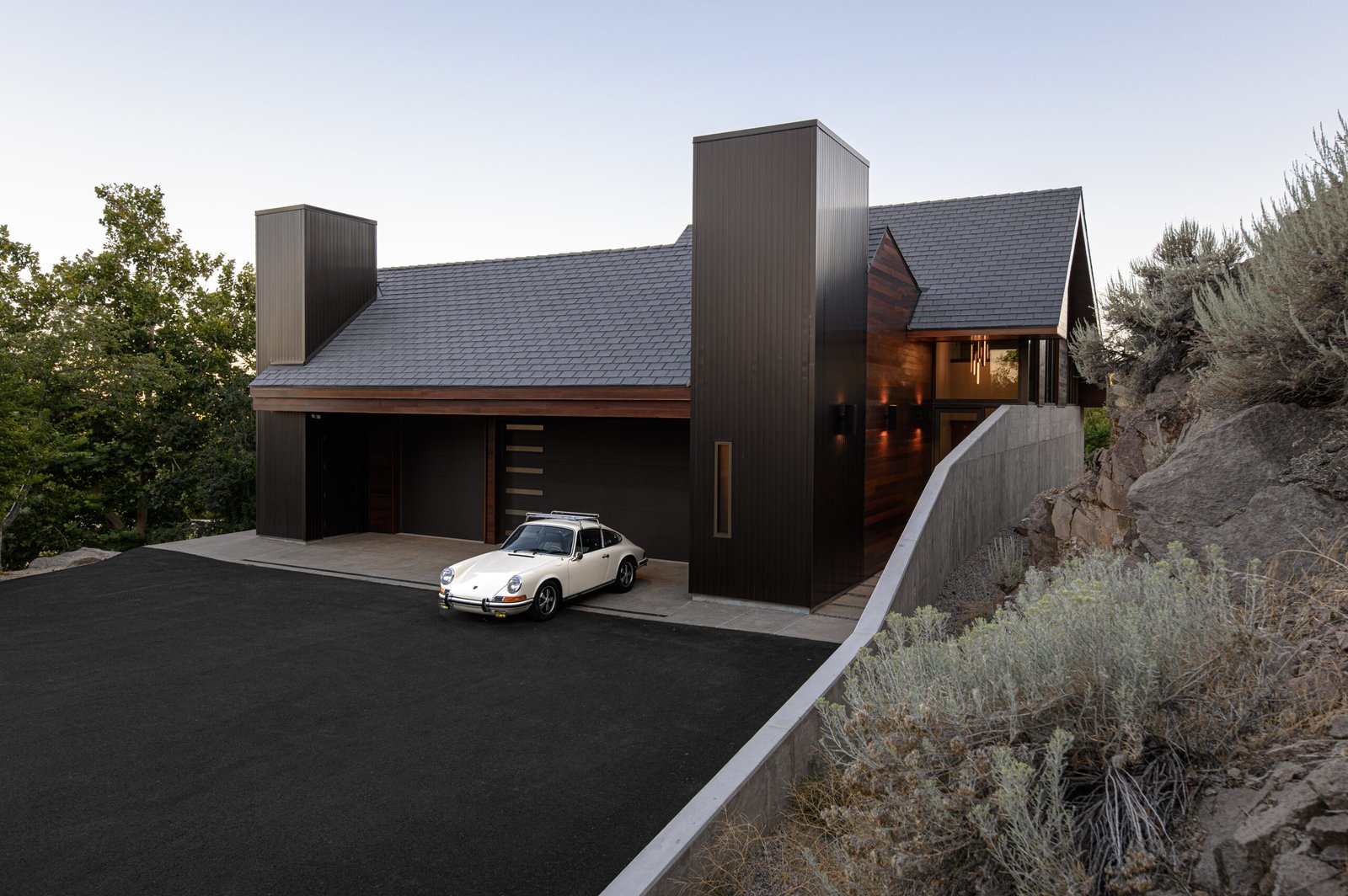 This project commenced with our clients' acquisition of a late modernist period home, designed by esteemed Swiss architect Eduard Dreier. The clients were determined to restore the 1970s gem to its pristine original state, focusing on sanding and refinishing the exterior mahogany and meticulously cleaning the original anodized aluminum windows and vertical siding. This all-encompassing transformation breathed new life into the residence, minimizing waste through careful restoration both inside and out. The original home came with multiple parcels, prompting the clients to consider adding a detached garage and an Accessory Dwelling Unit (ADU) to accommodate their cherished Porsche collection and provide a separate living space for family and guests. This project was designed with a strong emphasis on sustainability. A central component of the project was the inclusion of a renewable energy system aimed at achieving net zero energy for more than eight months of the year. The couple drilled 300-foot deep geothermal wells to update the existing heating system, using the earth’s natural temperature for efficient heating and cooling. Alongside this, they installed modern heat pumps with advanced control systems to optimize energy use and significantly reduce the home’s carbon footprint. Moreover, a solar thermal system was incorporated to harness solar energy for heating water, reducing reliance on fossil fuels. These sustainable practices not only fulfill environmental responsibilities but also provide financial benefits; the renewable energy system is expected to pay for itself in energy savings over approximately seven years for photovoltaic panels and up to 30 years for geothermal wells. During the construction of the guesthouse and garage, the couple repurposed 2,780 metric tons of excavated rock for retaining walls and pathways, minimizing waste and promoting local sourcing. In their renovation efforts, the clients embarked on exhaustive searches for original tiles and wallpaper, restoring existing elements instead of replacing them. This commitment to authenticity aligns with sustainable practices and reduces the environmental impact of manufacturing new products. Furthermore, water-saving fixtures and rainwater harvesting systems were implemented to conserve water resources and lower overall consumption. These initiatives highlight the clients' dedication to sustainability while honoring the original architectural vision of the house, merging environmental responsibility with historical preservation. The design process was a unique exploration of the original hand-drawn architectural plans, distilling the essence and principles that would guide the new project. Consideration of the site’s constraints led to thoughtful positioning of the new addition, nestled at the end of the main home's cul-de-sac driveway. This location offered unobstructed views of the Virginia Range and Mt. Rose, maximizing natural light and minimizing the need for artificial lighting. Overall, the project aimed to seamlessly integrate the new structures into the estate, making them feel like an original part of the home while embodying sustainability and respect for architectural heritage.
