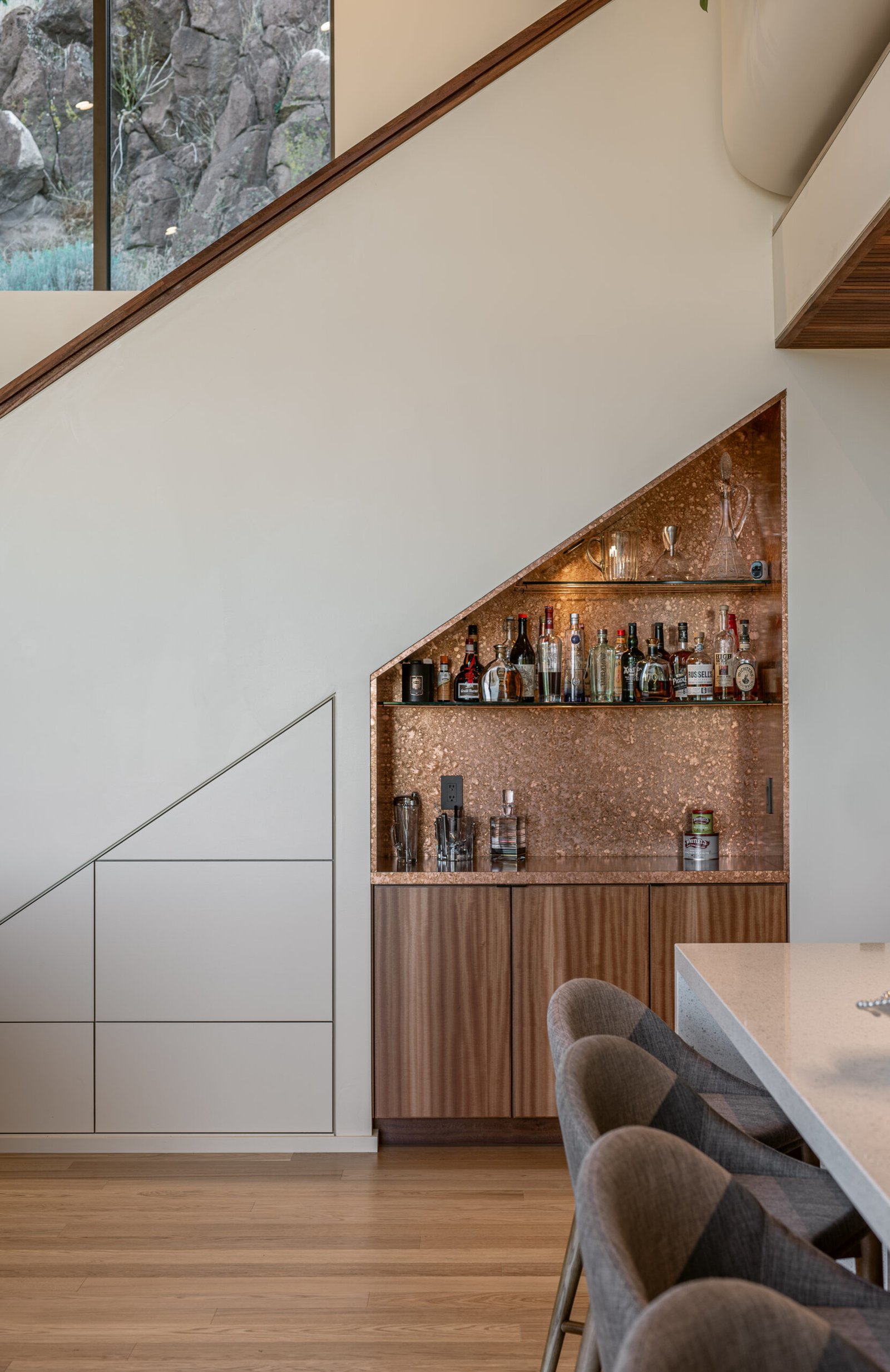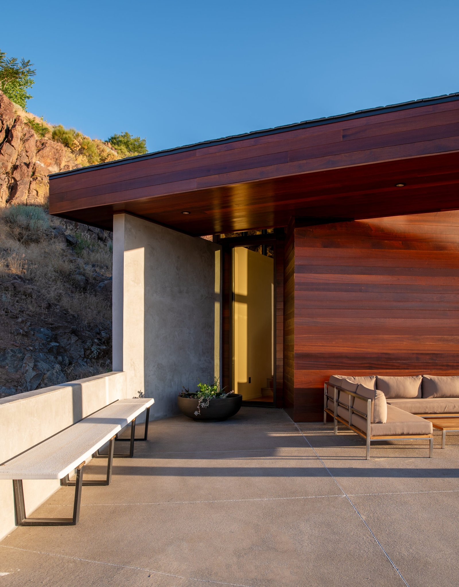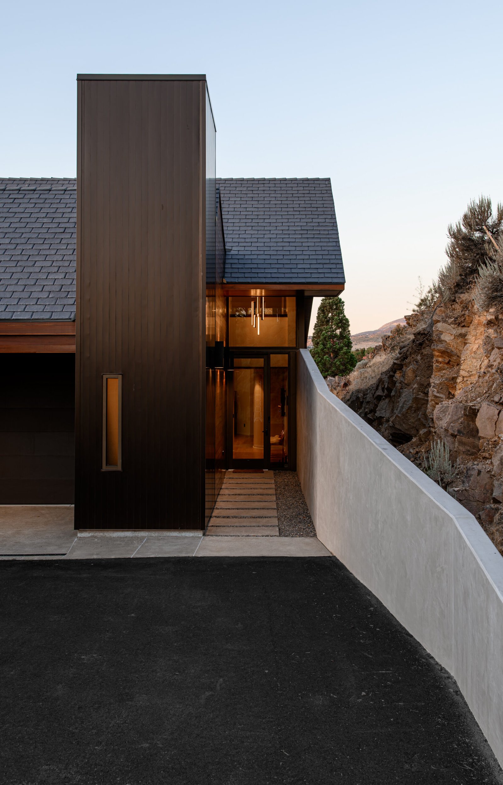 This project commenced with our clients' acquisition of a late modernist period home, designed by esteemed Swiss architect Eduard Dreier. The clients were determined to restore the 1970s gem to its pristine original state, focusing on sanding and refinishing the exterior mahogany and meticulously cleaning the original anodized aluminum windows and vertical siding. This all-encompassing transformation breathed new life into the residence, minimizing waste through careful restoration both inside and out. The original home came with multiple parcels, prompting the clients to consider adding a detached garage and an Accessory Dwelling Unit (ADU) to accommodate their cherished Porsche collection and provide a separate living space for family and guests. This project was designed with a strong emphasis on sustainability. A central component of the project was the inclusion of a renewable energy system aimed at achieving net zero energy for more than eight months of the year. The couple drilled 300-foot deep geothermal wells to update the existing heating system, using the earth’s natural temperature for efficient heating and cooling. Alongside this, they installed modern heat pumps with advanced control systems to optimize energy use and significantly reduce the home’s carbon footprint. Moreover, a solar thermal system was incorporated to harness solar energy for heating water, reducing reliance on fossil fuels. These sustainable practices not only fulfill environmental responsibilities but also provide financial benefits; the renewable energy system is expected to pay for itself in energy savings over approximately seven years for photovoltaic panels and up to 30 years for geothermal wells. During the construction of the guesthouse and garage, the couple repurposed 2,780 metric tons of excavated rock for retaining walls and pathways, minimizing waste and promoting local sourcing. In their renovation efforts, the clients embarked on exhaustive searches for original tiles and wallpaper, restoring existing elements instead of replacing them. This commitment to authenticity aligns with sustainable practices and reduces the environmental impact of manufacturing new products. Furthermore, water-saving fixtures and rainwater harvesting systems were implemented to conserve water resources and lower overall consumption. These initiatives highlight the clients' dedication to sustainability while honoring the original architectural vision of the house, merging environmental responsibility with historical preservation. The design process was a unique exploration of the original hand-drawn architectural plans, distilling the essence and principles that would guide the new project. Consideration of the site’s constraints led to thoughtful positioning of the new addition, nestled at the end of the main home's cul-de-sac driveway. This location offered unobstructed views of the Virginia Range and Mt. Rose, maximizing natural light and minimizing the need for artificial lighting. Overall, the project aimed to seamlessly integrate the new structures into the estate, making them feel like an original part of the home while embodying sustainability and respect for architectural heritage.