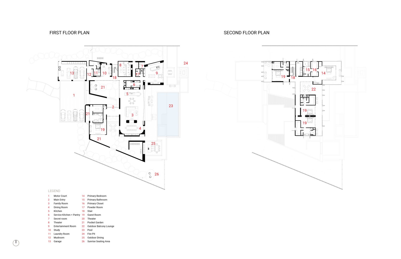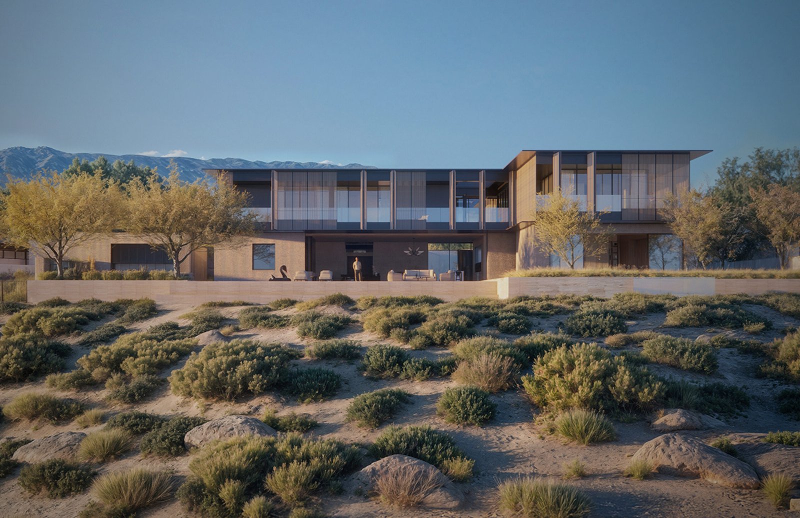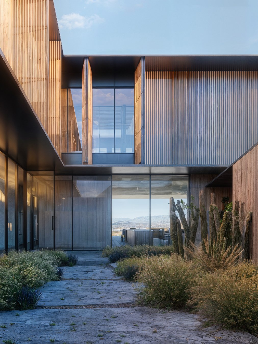 Situated within the Mojave Desert, Echo takes its name from the interplay between mass and void, solid and ephemeral. The residence was conceived not as an object imposed upon its site but as an immersive sequence shaped by rhythm, proportion, and light. Its ribbed concrete structure establishes permanence and gravitas, while wood screens, courtyards, and apertures lend porosity and fluidity, creating a dialogue between architecture and environment. The design intent was to achieve a duality: protection against the harsh desert climate while embracing its beauty. Monumental concrete ribs anchor the home, their repetition providing both structural stability and an expressive cadence. Between them, wood slats act as filters, controlling daylight, mediating privacy, and softening transitions between inside and out. Circulation unfolds like a score of light and shadow: compressed corridors release into expansive courts and living spaces, courtyards provide pauses, and each turn reveals framed views of sky or horizon. Programmatically, Echo balances intimacy and openness. Shared family spaces flow into shaded outdoor rooms, extending daily life beyond the enclosure without additional energy demand. Private suites are tucked into protective recesses, each oriented to harness daylight while shielding from excessive solar gain. The central courtyard acts as the heart of the home, a climatic lung that captures breezes, moderates temperature, and anchors the spatial order. Material choices deepen the narrative of durability and resonance. Concrete, cast with ribbed texture, absorbs and releases heat as thermal mass, stabilizing interiors across dramatic temperature swings. Reclaimed wood introduces warmth and tactility, its weathering a natural counterpoint to concrete’s permanence. Openings are carved with precision, recalling canyon slots that frame desert vistas and trace the passage of time across the façade. Constraints of climate and resource scarcity informed every move. The desert sun dictated rooflines and overhangs, while the scarcity of water drove the integration of drought-tolerant landscaping and efficient irrigation systems. The home’s layered strategy creates a resilient dwelling that adapts to seasonal extremes while reducing reliance on mechanical systems. Ultimately, Echo is conceived as an inhabitable rhythm. Its architecture is neither static nor ornamental, but performative, transforming the cycles of light, wind, and shadow into an architectural language. By uniting permanence with porosity, resilience with refinement, Echo redefines desert living as an experience of connection and wonder.