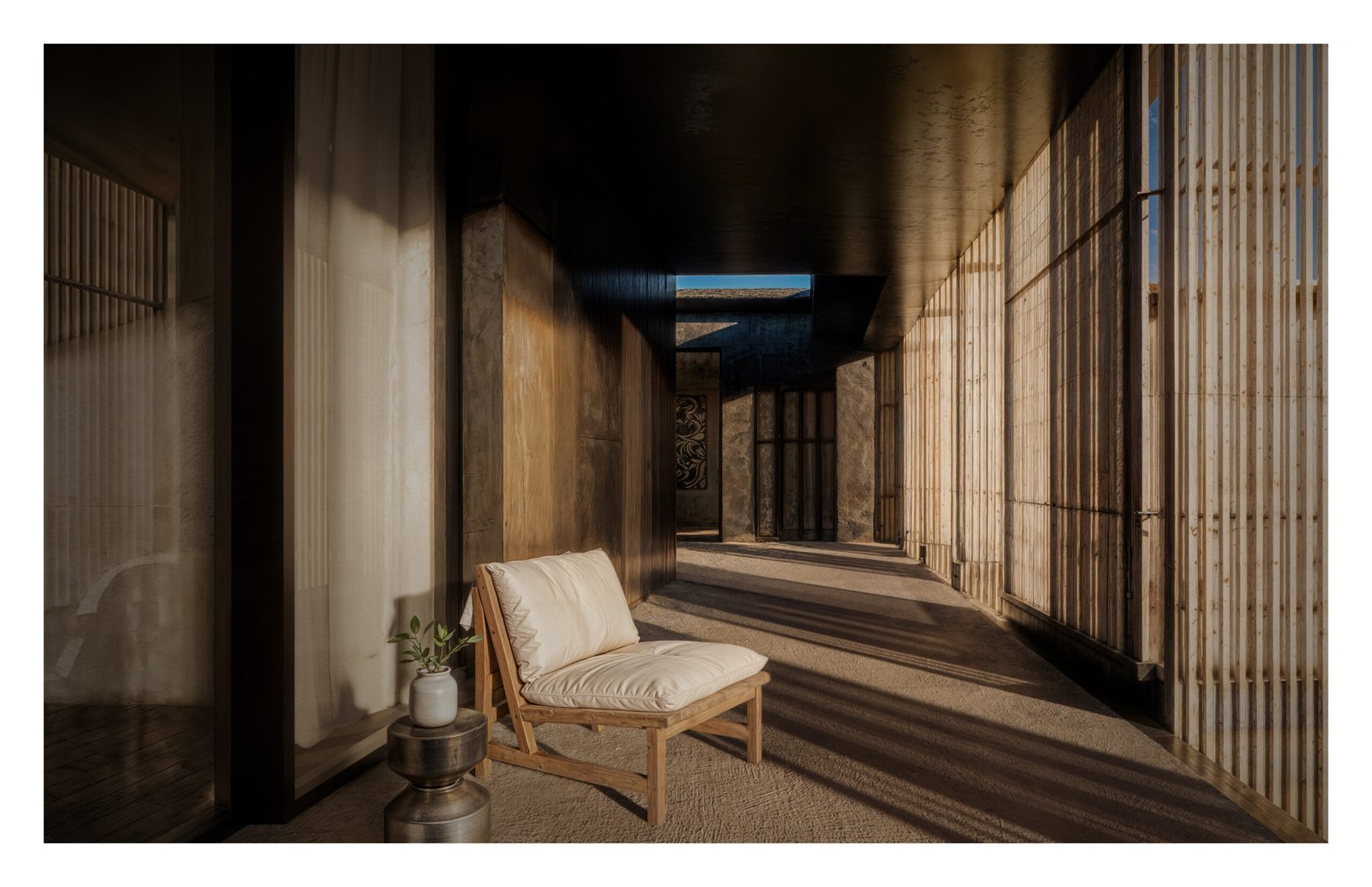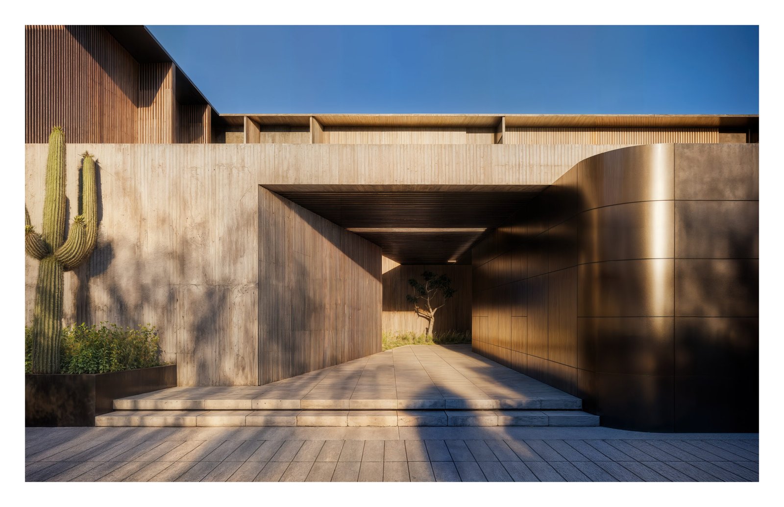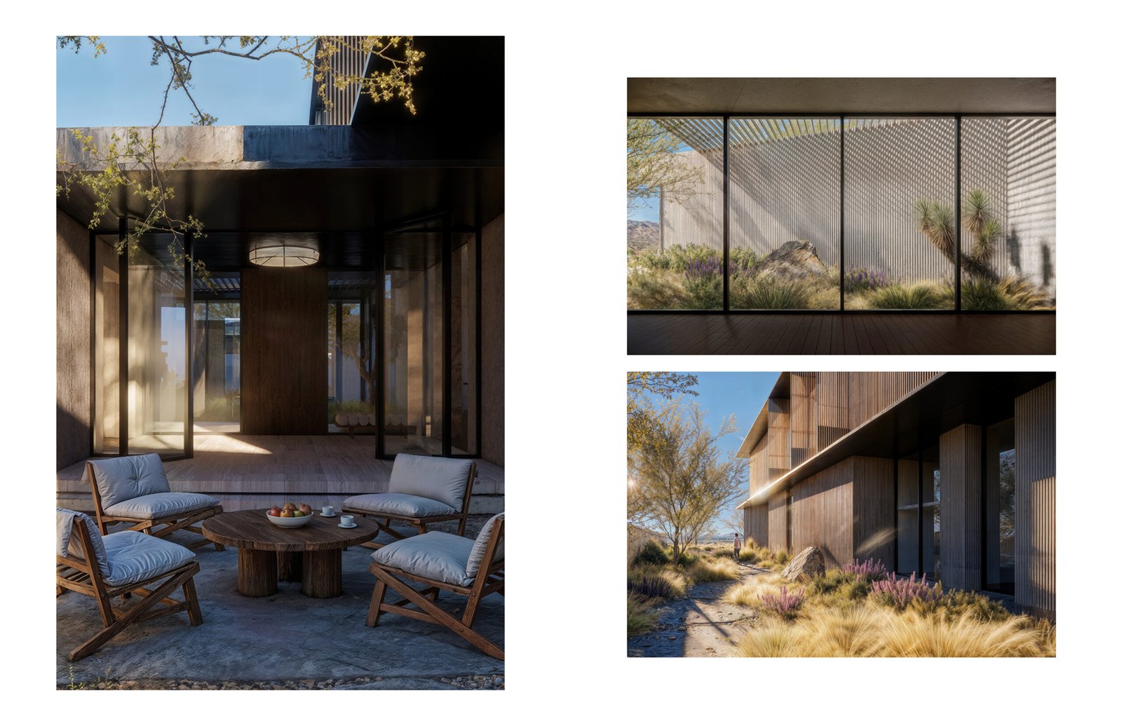 Echo emerges from the desert as both shelter and sculpture, its ribbed concrete walls and slatted wood screens forming a dialogue of permanence and lightness. The design balances monumentality with porosity, using repetition and rhythm to root the home in its site while framing shifting patterns of light and shadow. Circulation unfolds as a series of orchestrated thresholds: narrow passages release into expansive living areas, while shaded courtyards act as extensions of interior space. These spatial sequences reflect the client’s desire for both retreat and gathering, creating a residence that is private yet porous, protective yet open to its environment. Material honesty grounds the architecture. Ribbed concrete provides thermal stability, reclaimed wood softens its rigor, and operable glazing opens the home to desert winds. Together, these elements embody a synthesis of form, performance, and experience. Echo is more than a house; it is an experiential framework that reveals the desert through rhythm, light, and time. Its architecture demonstrates that resilience and refinement can coexist, transforming passive environmental strategies into an expressive design language that connects human habitation to the elemental conditions of its site.