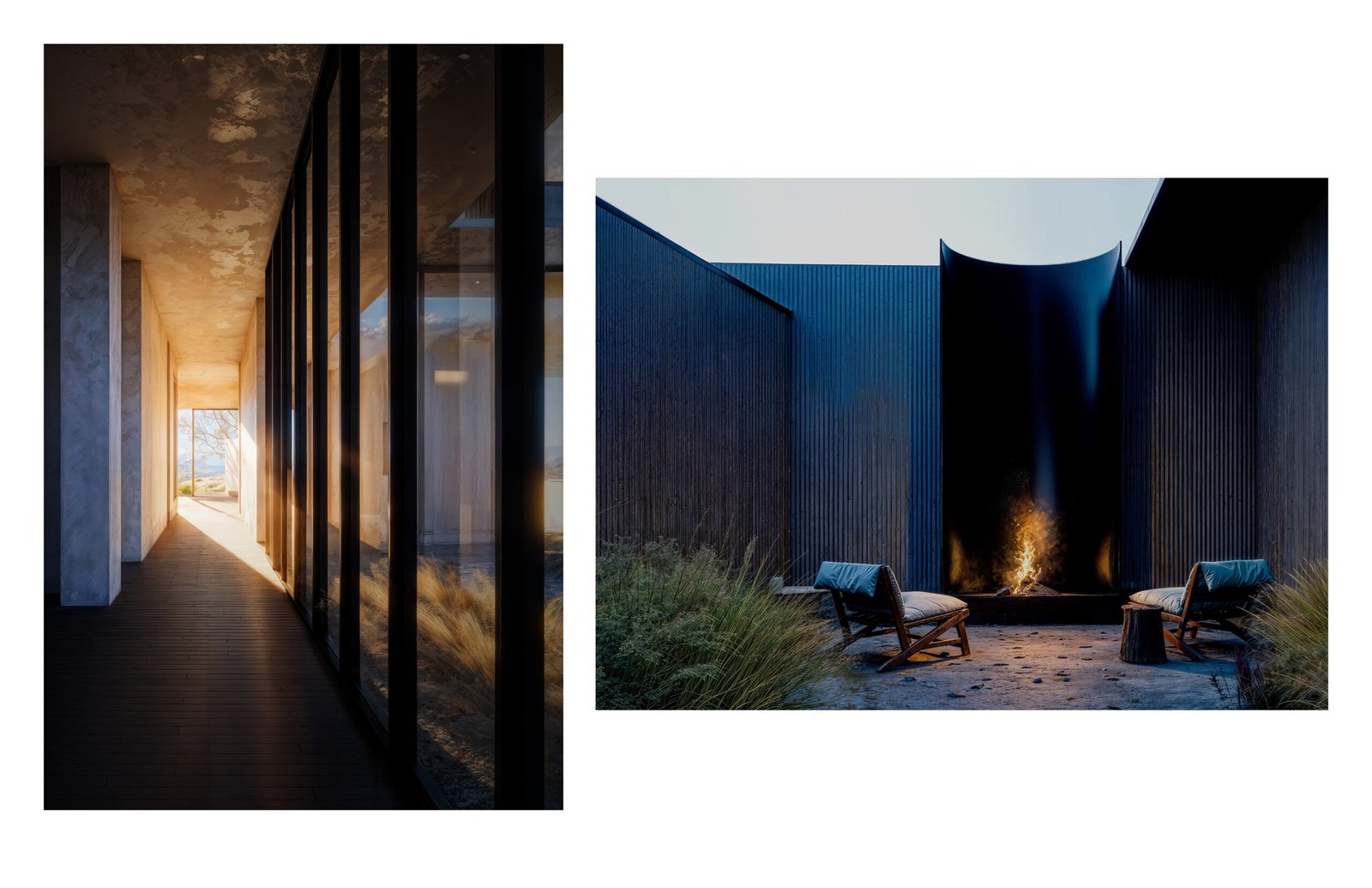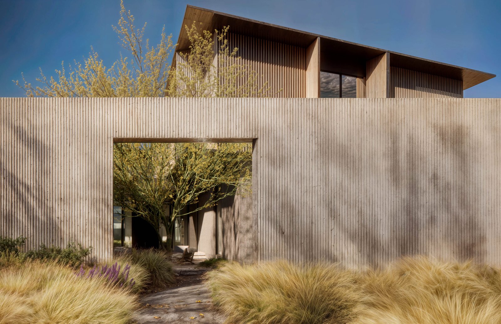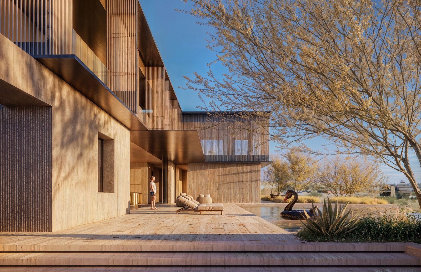 Echo emerges from the desert as both shelter and sculpture, its ribbed concrete walls and slatted wood screens forming a dialogue of permanence and lightness. The design balances monumentality with porosity, using repetition and rhythm to root the home in its site while framing shifting patterns of light and shadow. Circulation unfolds as a series of orchestrated thresholds: narrow passages release into expansive living areas, while shaded courtyards act as extensions of interior space. These spatial sequences reflect the client’s desire for both retreat and gathering, creating a residence that is private yet porous, protective yet open to its environment. Material honesty grounds the architecture. Ribbed concrete provides thermal stability, reclaimed wood softens its rigor, and operable glazing opens the home to desert winds. Together, these elements embody a synthesis of form, performance, and experience. Echo is more than a house; it is an experiential framework that reveals the desert through rhythm, light, and time. Its architecture demonstrates that resilience and refinement can coexist, transforming passive environmental strategies into an expressive design language that connects human habitation to the elemental conditions of its site.