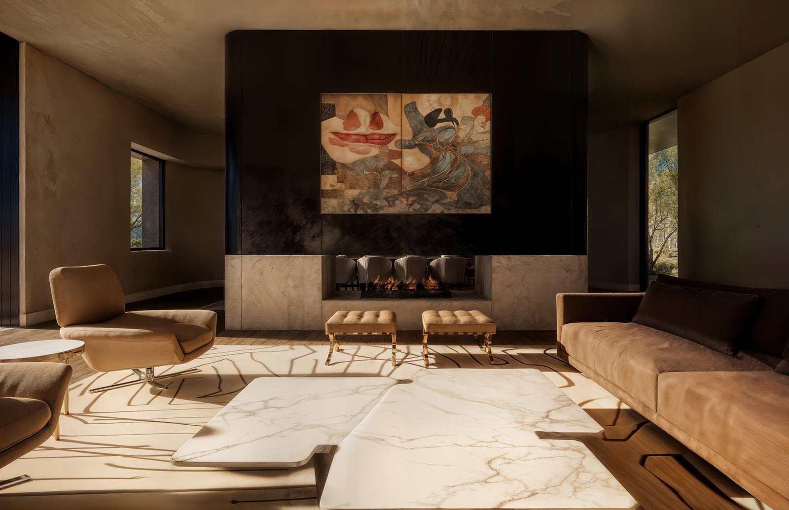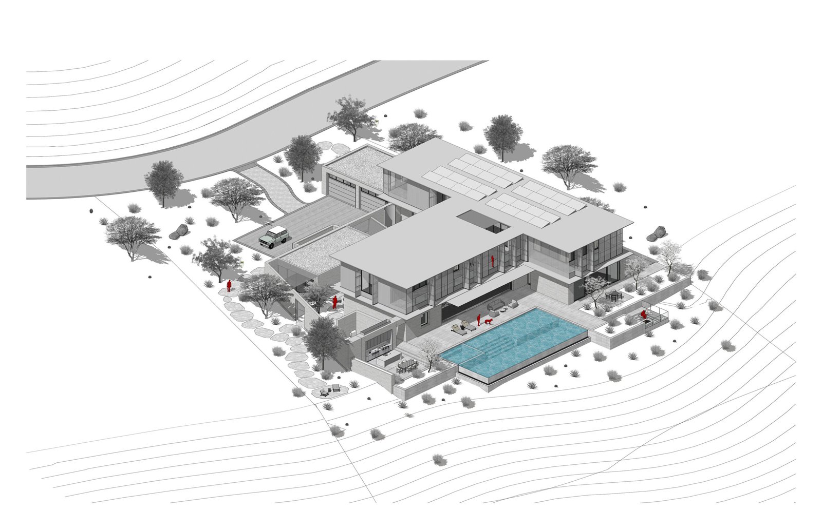 Echo’s environmental performance is inseparable from its architectural identity. Ribbed concrete walls act as thermal mass, absorbing heat by day and releasing it by night to stabilize interiors. Wood slat screens extend this strategy, filtering daylight, mitigating solar gain, and enabling natural ventilation through operable openings. Together, they reduce dependence on mechanical conditioning while enriching the home’s sculptural rhythm. The central courtyard serves as a climatic lung, channeling breezes for cross-ventilation and cooling while extending living areas into shaded, naturally conditioned outdoor rooms. Roof overhangs and recessed glazing choreograph shade, while drought-tolerant planting and efficient irrigation reinforce water stewardship and ecological continuity. Material selections emphasize resilience, longevity, and wellness. Concrete and reclaimed wood were chosen for durability and graceful aging, reducing replacement cycles. Low-VOC finishes ensure healthy indoor air quality, while expansive glazing provides abundant daylight and visual connection to the desert landscape, enhancing human well-being. Echo demonstrates that sustainability and poetics are not parallel agendas but one inseparable language. By embedding environmental performance into form, structure, and materiality, the home achieves resilience without compromise, transforming passive strategies into a source of artistry, delight, and enduring human connection to place.