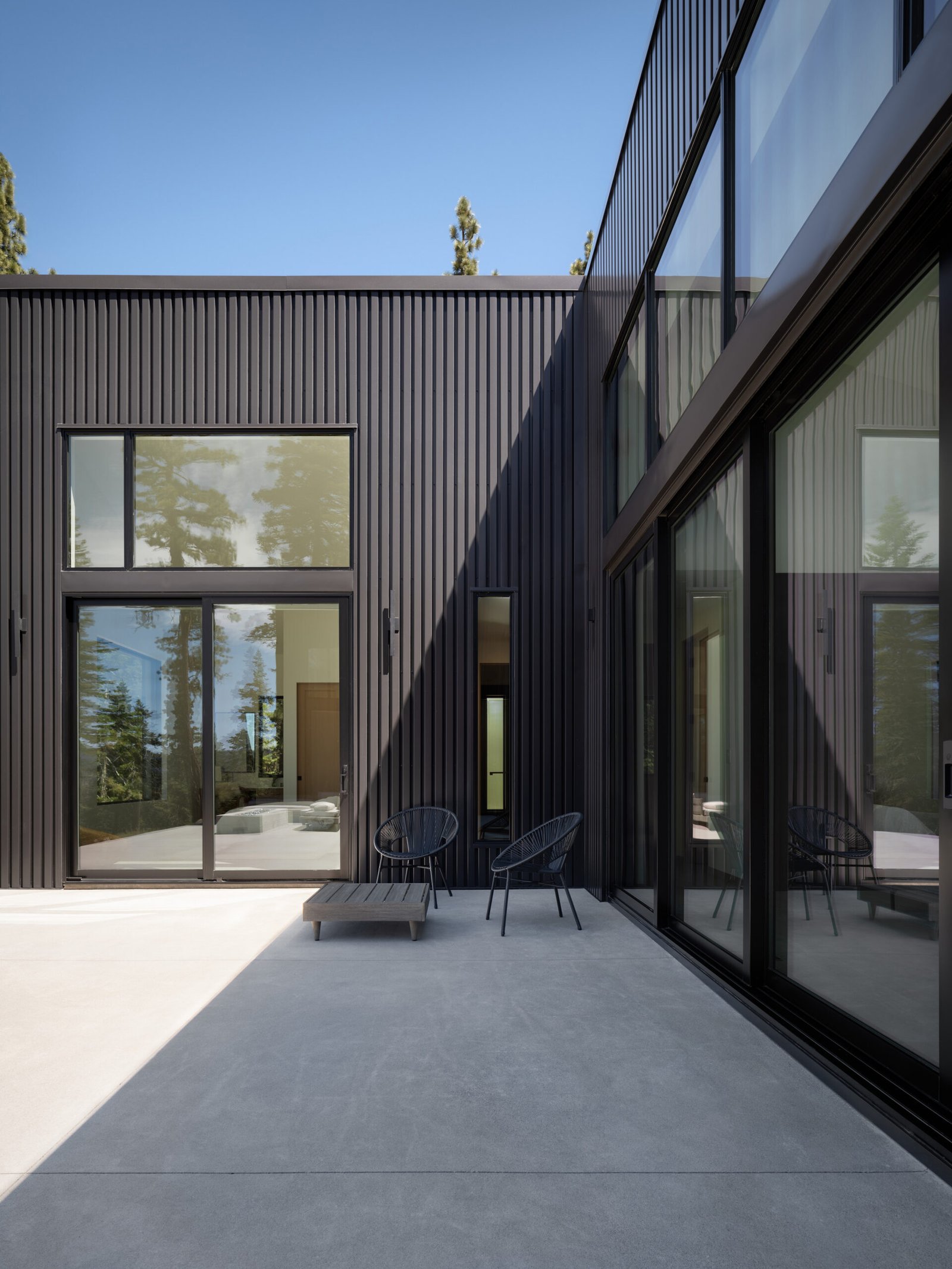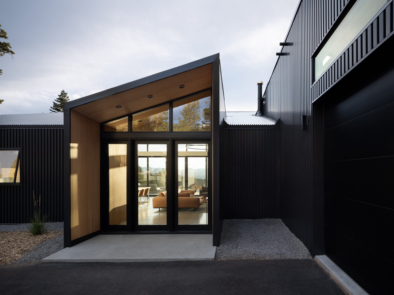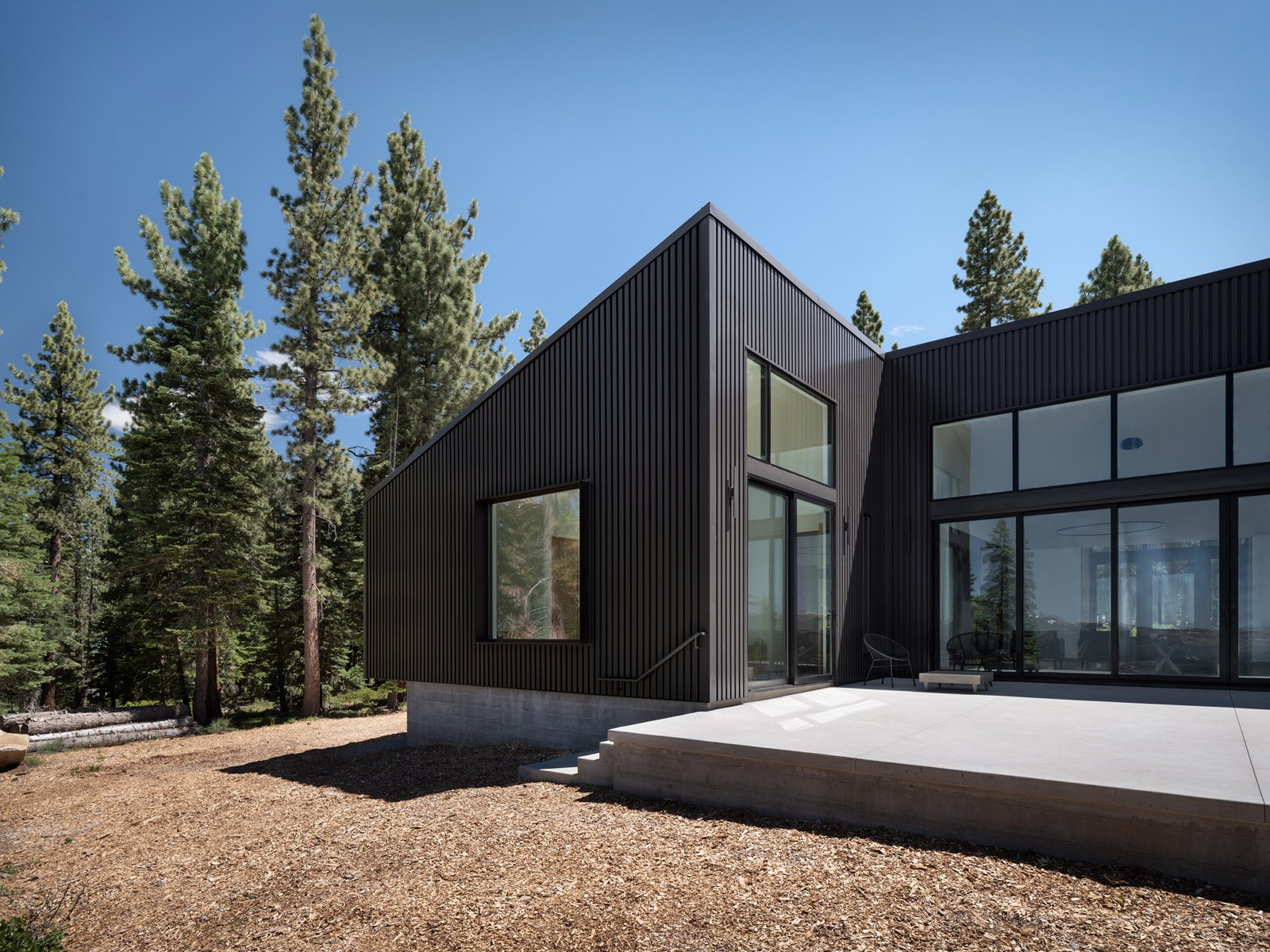 Nestled in the Sierra Nevada Mountains on the eastern outskirts of Truckee, California, in a serene rural setting, this remarkable home is perched on a ridge just below the historic Martis Peak fire outlook, overlooking Glenshire. Its westerly orientation yields unobstructed, panoramic vistas that span a full 180 degrees, encompassing iconic peaks along the Sierra Crest, such as Donner Peak, Tinker Knob, and Castle Peak. To the west, it offers sweeping views of the town of Truckee and Donner Lake beyond. Approaching this newly constructed dwelling is an experience in itself. As you veer off the dirt road and wind your way through a densely forested approach, a captivating sight awaits you – a direct line of vision through the front door's glass entry, framing the awe-inspiring views beyond. The design of this home is a thoughtful and purposeful response to its natural surroundings, skillfully integrating the breathtaking landscape and meticulously framing the expansive views. Built for a family of three, the layout features the primary suite on one side and a daughter's room on the other, both with direct access to the central exterior courtyard, creating a seamless connection with the outdoors. This project conscientiously acknowledges its location and the growing threat of wildfires, especially given that the owner is a retired fire chief. Materials and forms were selected not just for their aesthetics, but also for their functionality. The use of black corrugated walls and roofs offers uniformity, durability, and serves as a critical fire protection measure, providing a non-combustible shell in an area at high risk of wildfires. An expansive concrete patio serves as a vital bridge between the interior spaces and serves as another non-combustible element of the home. The design incorporates simple shed roofs/prisms, each thoughtfully oriented away from the central courtyard and access points to offer protection against snow accumulation and watershed concerns. This home is not just a place of beauty; it's a sanctuary designed to respect and coexist harmoniously with its remarkable natural surroundings.
