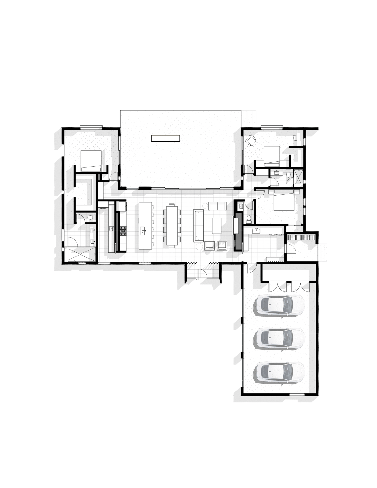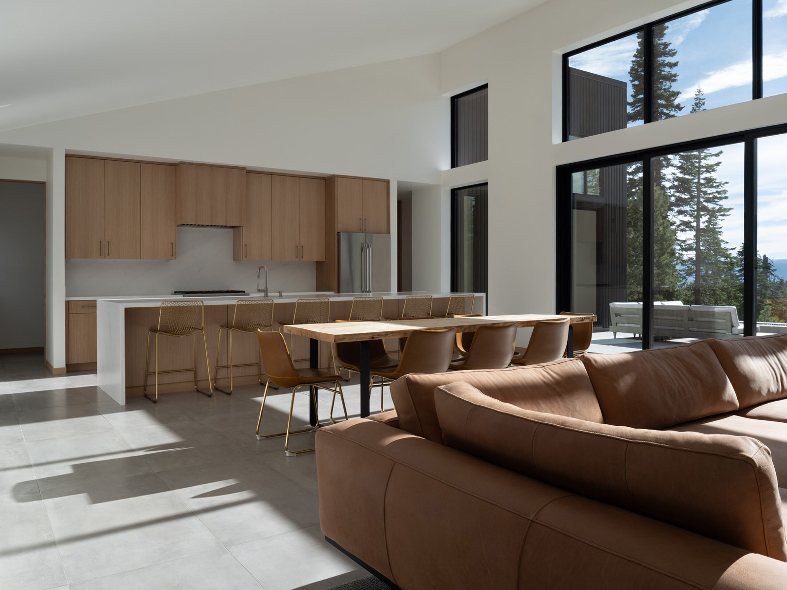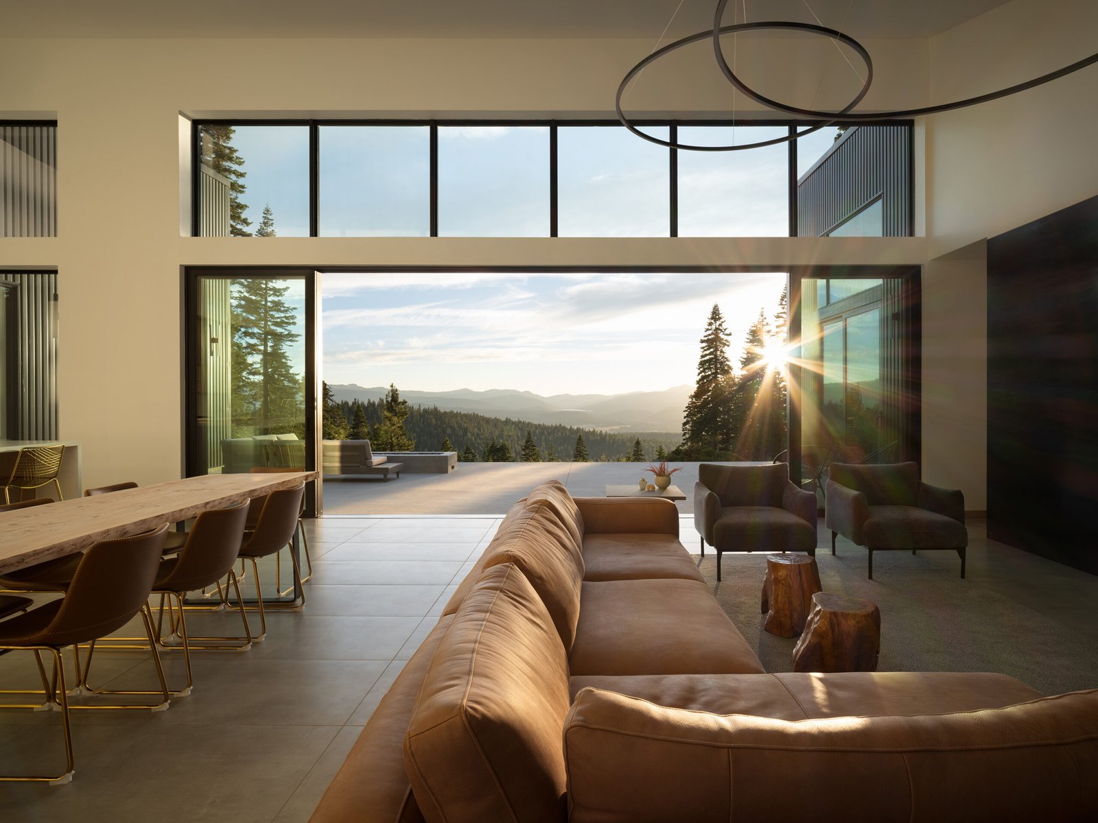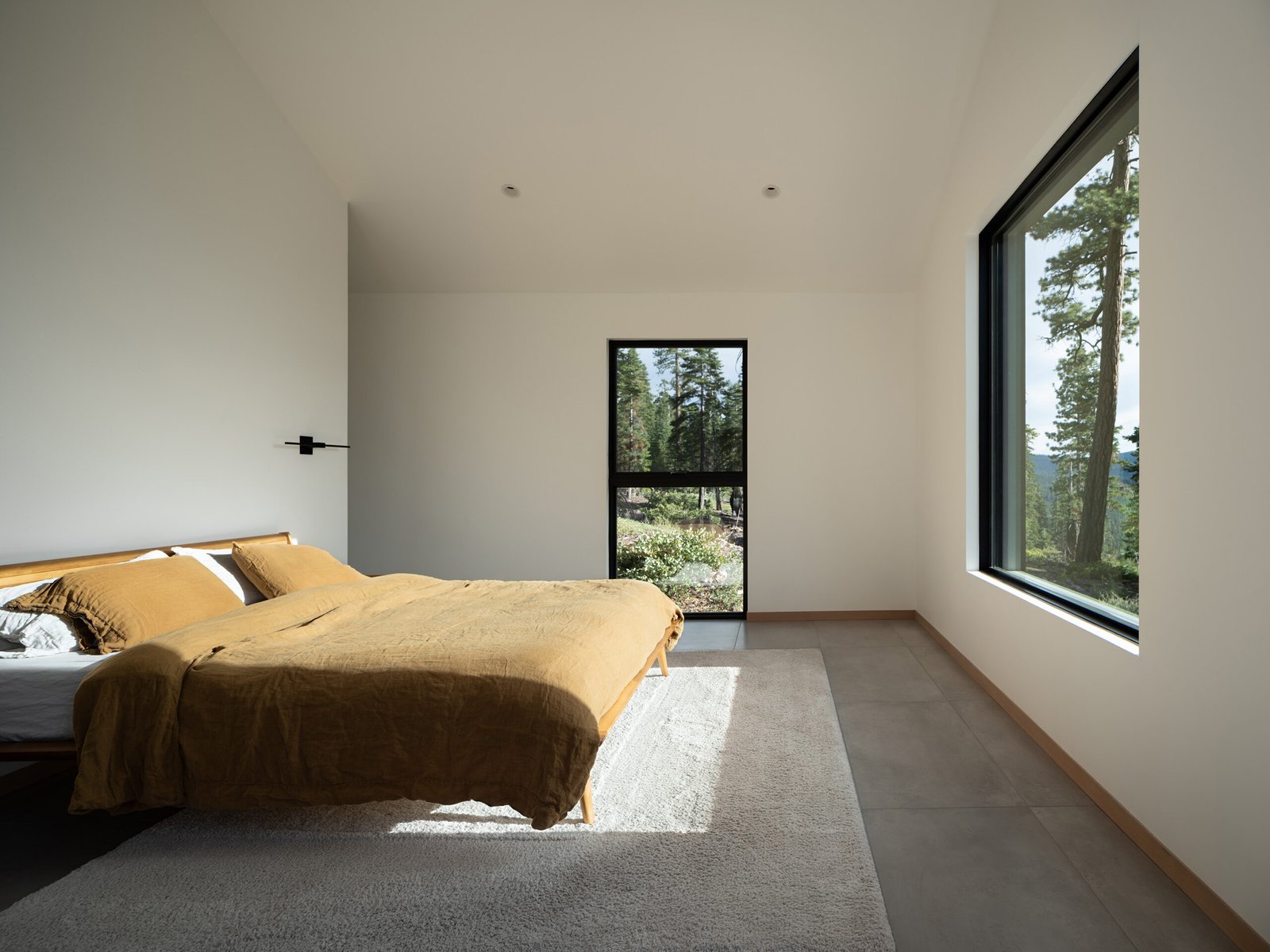 Nestled in the Sierra Nevada Mountains on the eastern outskirts of Truckee, California, in a serene rural setting, this remarkable home is perched on a ridge just below the historic Martis Peak fire outlook, overlooking Glenshire. Its westerly orientation yields unobstructed, panoramic vistas that span a full 180 degrees, encompassing iconic peaks along the Sierra Crest, such as Donner Peak, Tinker Knob, and Castle Peak. To the west, it offers sweeping views of the town of Truckee and Donner Lake beyond. Approaching this newly constructed dwelling is an experience in itself. As you veer off the dirt road and wind your way through a densely forested approach, a captivating sight awaits you – a direct line of vision through the front door's glass entry, framing the awe-inspiring views beyond. The design of this home is a thoughtful and purposeful response to its natural surroundings, skillfully integrating the breathtaking landscape and meticulously framing the expansive views. Built for a family of three, the layout features the primary suite on one side and a daughter's room on the other, both with direct access to the central exterior courtyard, creating a seamless connection with the outdoors. This project conscientiously acknowledges its location and the growing threat of wildfires, especially given that the owner is a retired fire chief. Materials and forms were selected not just for their aesthetics, but also for their functionality. The use of black corrugated walls and roofs offers uniformity, durability, and serves as a critical fire protection measure, providing a non-combustible shell in an area at high risk of wildfires. An expansive concrete patio serves as a vital bridge between the interior spaces and serves as another non-combustible element of the home. The design incorporates simple shed roofs/prisms, each thoughtfully oriented away from the central courtyard and access points to offer protection against snow accumulation and watershed concerns. This home is not just a place of beauty; it's a sanctuary designed to respect and coexist harmoniously with its remarkable natural surroundings.