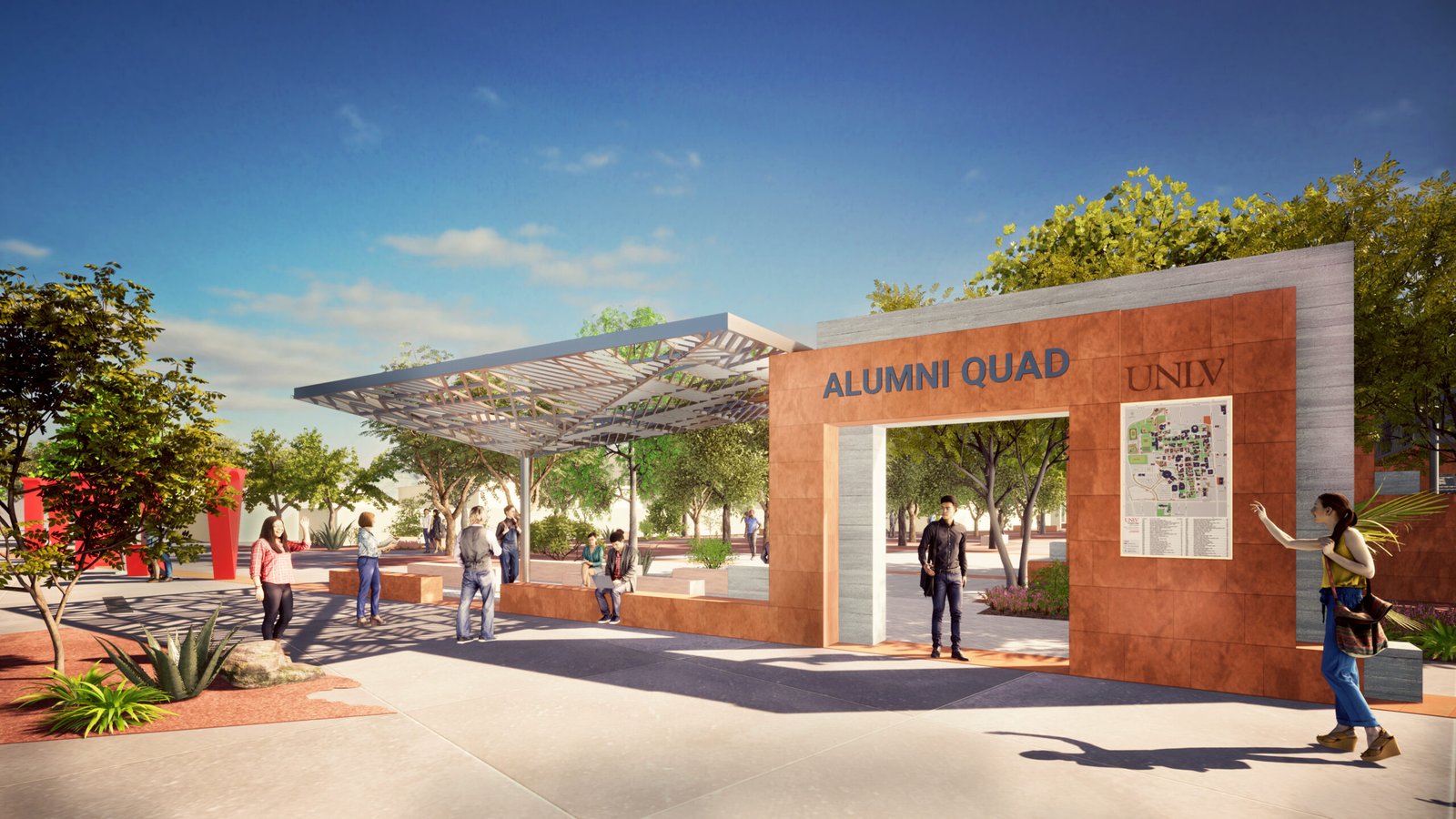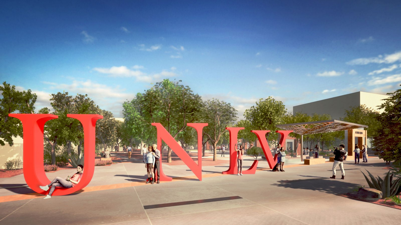 gathering point for small or large groups. The design includes: a new campus arrival where visitors can express their UNLV pride; a series of