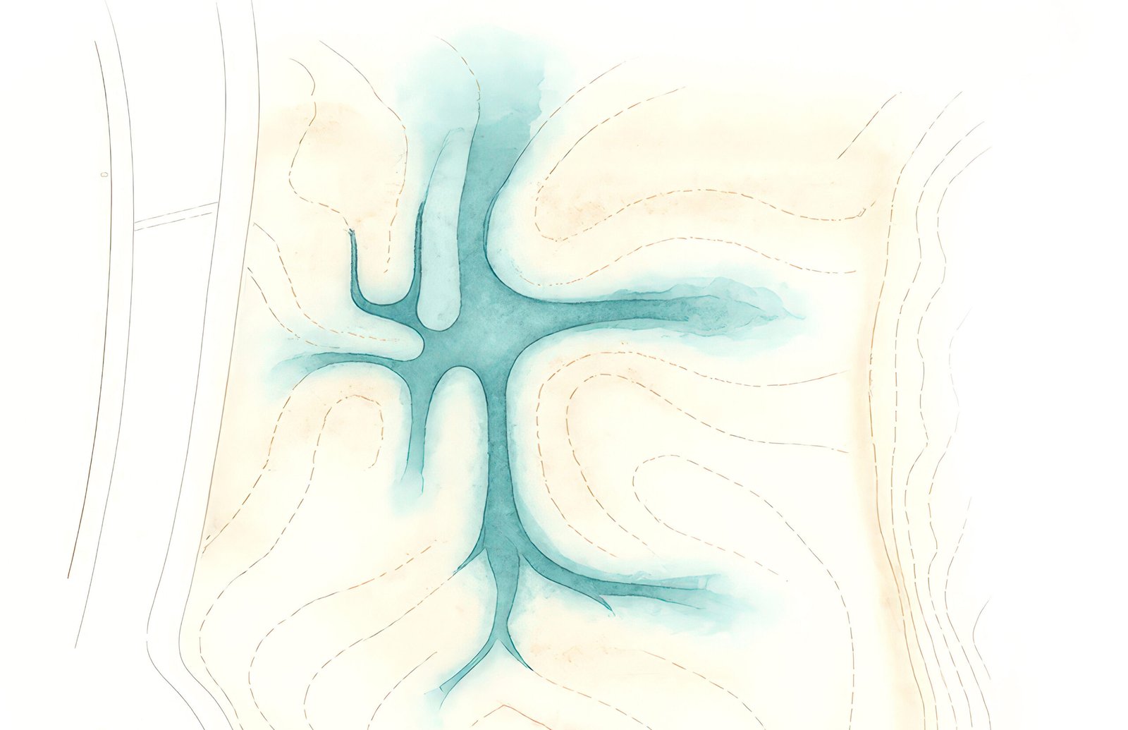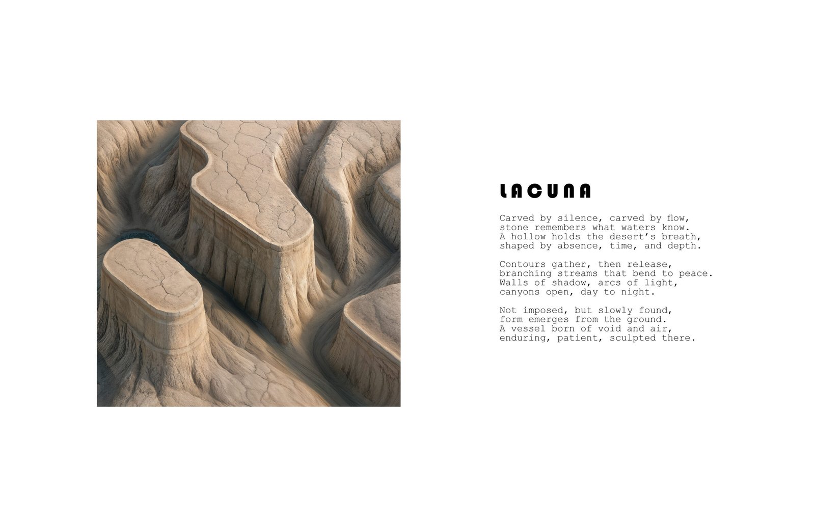 Carved by water and time, the arroyo is both a void and a vessel, a passage that reshapes the desert through cycles of erosion and renewal. From this phenomenon emerges Lacuna, a 7,700-square-foot single-family residence whose form is not imposed upon the land but revealed from it, as if eroded into being. The parti radiates outward from a central convergence, echoing the way tributaries gather and disperse across the desert terrain. Negative space holds equal weight to built form: courtyards, hollows, and carved passages guide movement fluidly between interior and exterior, between compression and release. Massing recalls canyon walls, their monolithic geometries layered with plywood-formed concrete, stone, wood, and weathering steel. These materials ground the home in the resilience of Red Rock Canyon, while openings align like water-cut slots, framing horizon, light, and shadow. Circulation unfolds as a canyon walk, narrow thresholds expanding into courtyards, light shifting across curving surfaces, water remembered in reflective pools. Lacuna is defined by absence as much as presence. It is a dwelling hollowed by metaphorical flow, where voids shape shelter and the architecture becomes a vessel for light, air, and time.