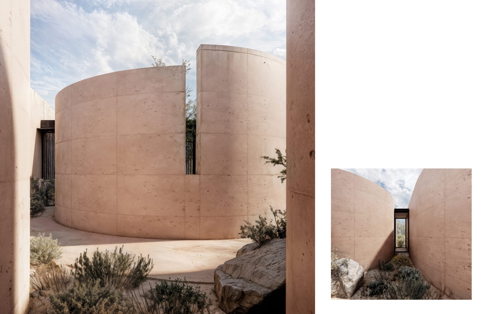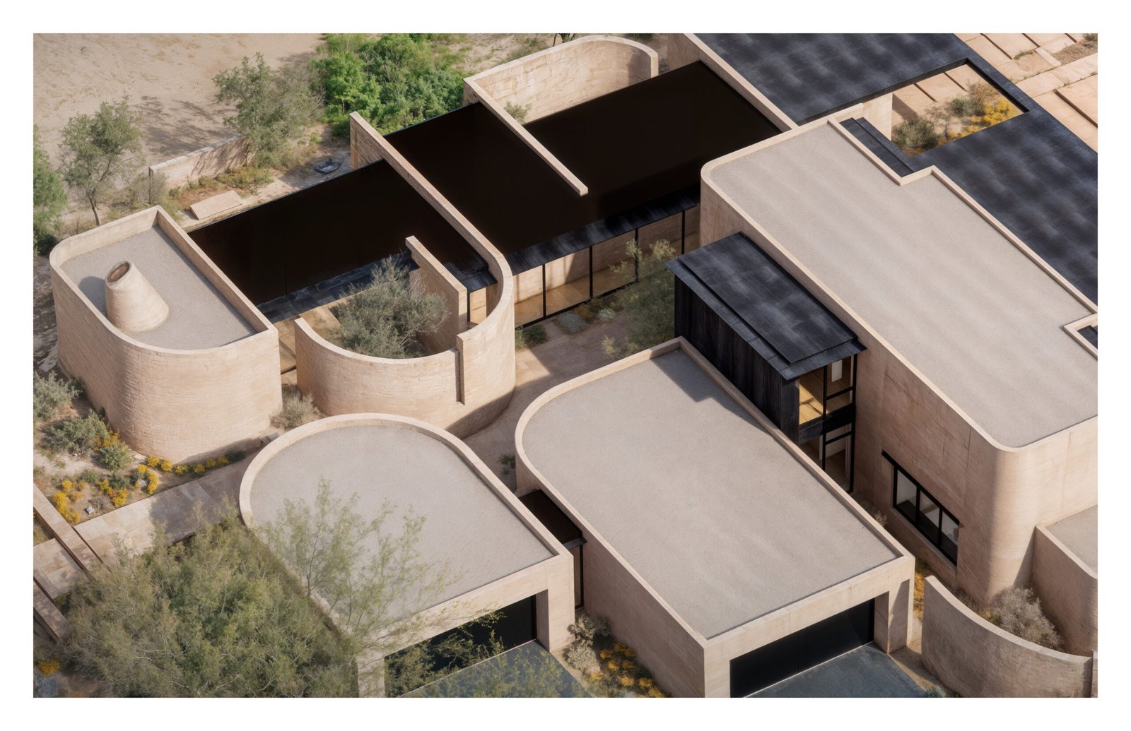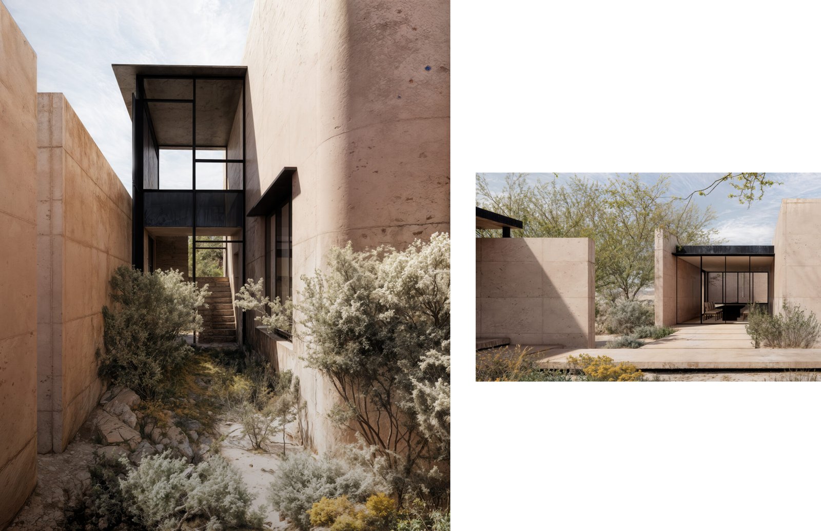 The desert is a landscape of absences as much as presences, where arroyos mark the memory of water long after it has passed. Out of this terrain, Lacuna takes shape as a 7,700-square-foot residence conceived not as an object placed upon the land, but as a form uncovered within it. Its architecture is guided by the logic of erosion, voids carved, passages revealed, and masses shaped by the natural forces of time. From these gestures emerges a dwelling where space flows like tributaries through a canyon, carrying light, air, and shadow as integral building materials. The parti emerges from the contours of the site, where landforms bend and converge like tributaries feeding into a wash. From this central convergence, the plan radiates outward, as if following the traces left by water across the terrain. The house is not conceived as an object placed upon the desert but as a presence revealed from it, a composition of subtraction where voids hold equal significance to built mass. Courtyards, hollows, and passages act as architectural tributaries, giving definition through absence as much as presence. Formally, the massing recalls canyon walls, with curving, monolithic geometries echoing the resilience of Red Rock Canyon. Circulation unfolds as a canyon walk: compressed passages open into expansive courtyards, narrow thresholds dissolve into broad living spaces, and shifting light washes across curved surfaces as the desert sun arcs overhead. The architecture choreographs a rhythm of compression and release, guiding inhabitants through sequences of shelter, exposure, shadow, and light. Materiality reinforces the geological metaphor. Plywood-formed concrete layers like sediment, its striations carrying the imprint of time. Stone anchors the home with geological weight, while wood softens transitions between spaces. Weathering steel, left to patina under desert air, echoes the slow transformation of canyon rock. Openings are treated as if carved by natural forces: apertures aligned with solar paths, skylights that wash surfaces with daylight, and windows that frame horizons like water-cut slots in stone. The experience of Lacuna is at once monumental and intimate. At the scale of the land, its massing rises like sculpted canyon walls. At the scale of daily life, its courtyards, reflective pools, and framed views create moments of pause, memory, and connection. Though water is scarce, its presence endures as metaphor: in the reflective surfaces that hold light like still pools, in the geometry of erosion expressed in form, and in the cycles of compression and release woven through movement. Lacuna is not merely a dwelling but a vessel for time and atmosphere. Defined by absence as much as presence, it emerges as a hollowed landscape where voids shape life as profoundly as walls. In its balance of erosion and construction, permanence and impermanence, the project offers an architecture inseparable from the desert that gave it form.