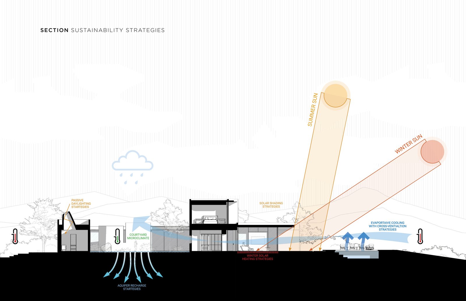 Sustainability in Lacuna is inseparable from its concept of erosion and renewal, where form, material, and performance align with the desert’s cycles. Courtyards, voids, and passages act as environmental tributaries, channeling airflow to promote natural cross-ventilation and the stack effect, reducing reliance on mechanical cooling. Reflective pools and shaded hollows amplify evaporative cooling, while green roofs insulate interior volumes and soften the building’s impact on the landscape. Material choices reinforce both durability and environmental stewardship. Plywood-formed concrete provides thermal mass, absorbing heat by day and releasing it at night to stabilize temperatures. Stone, wood, and weathering steel were selected for their longevity, low maintenance, and ability to patina gracefully, echoing the desert’s natural aging process. Locally sourced aggregates and drought-tolerant xeriscaping further reduce environmental footprint while blending architecture and ecology. Solar arrays and photovoltaic panels supply renewable energy, integrated unobtrusively into the roofscape. Rainwater harvesting and permeable surfaces capture and recycle precious water, supporting desert-appropriate planting and aligning with the AIA Framework’s focus on Water and Ecosystems. In Lacuna, performance and poetics are indivisible: an architecture revealed by subtraction, where environmental stewardship and geological metaphor converge into a resilient, enduring sanctuary.