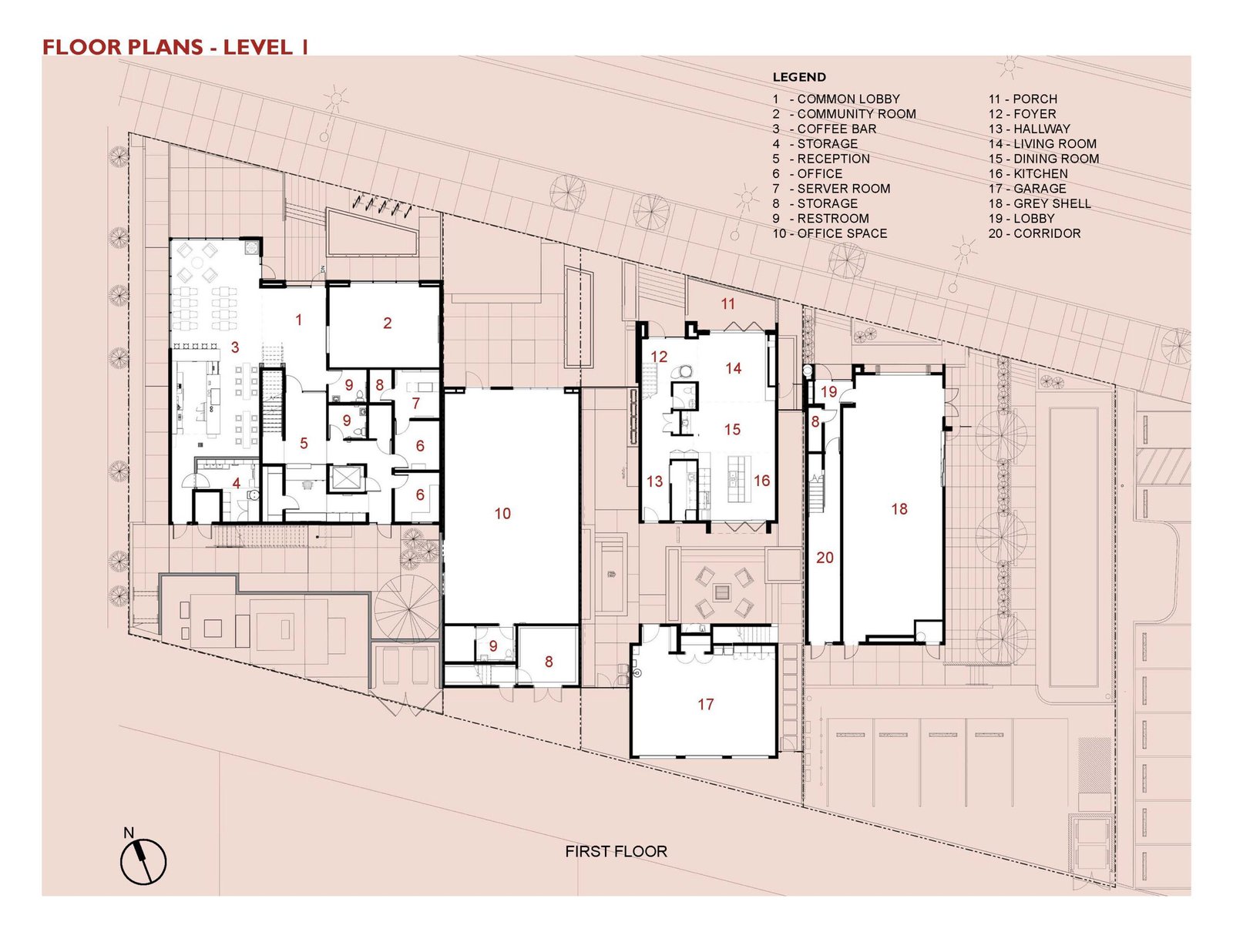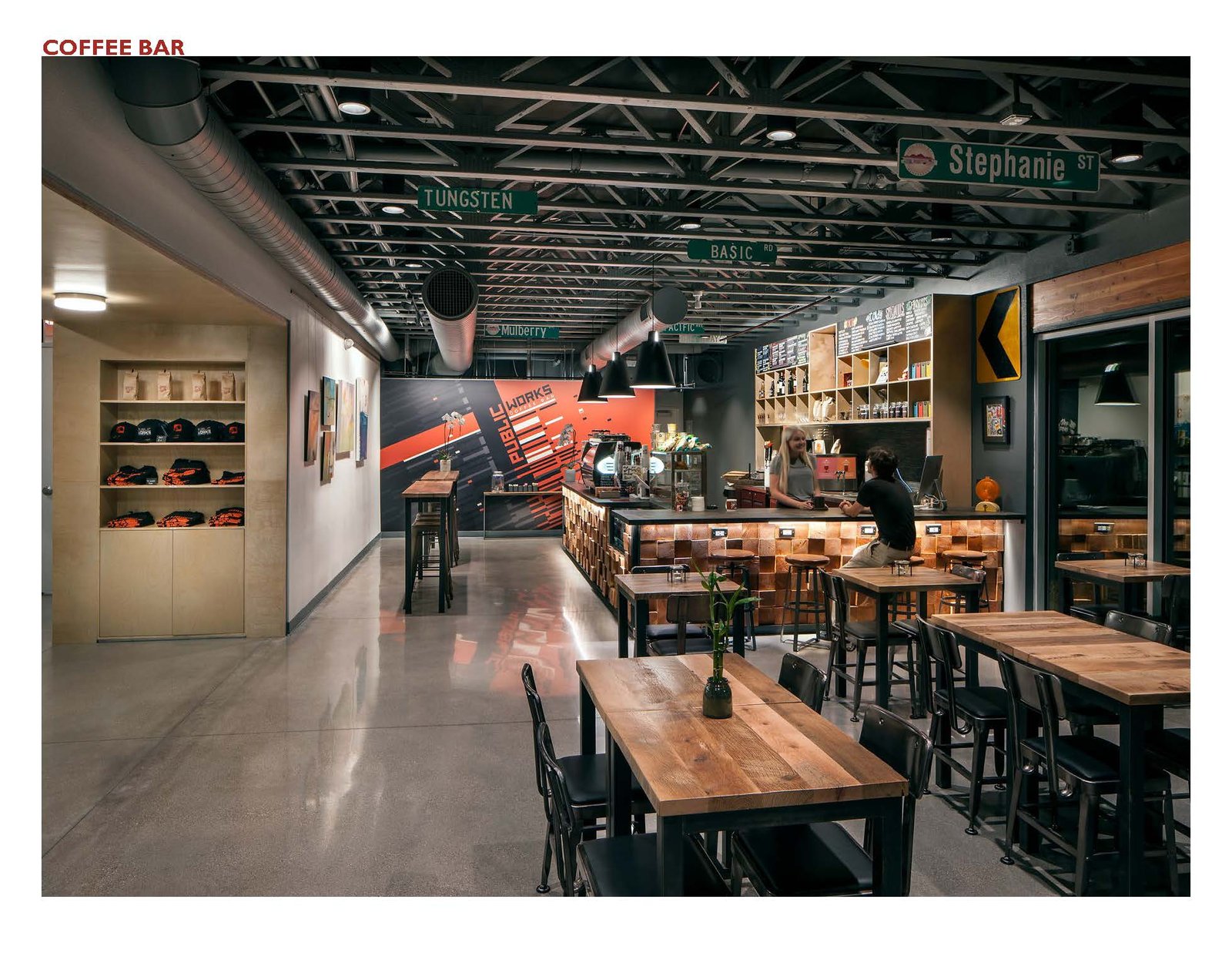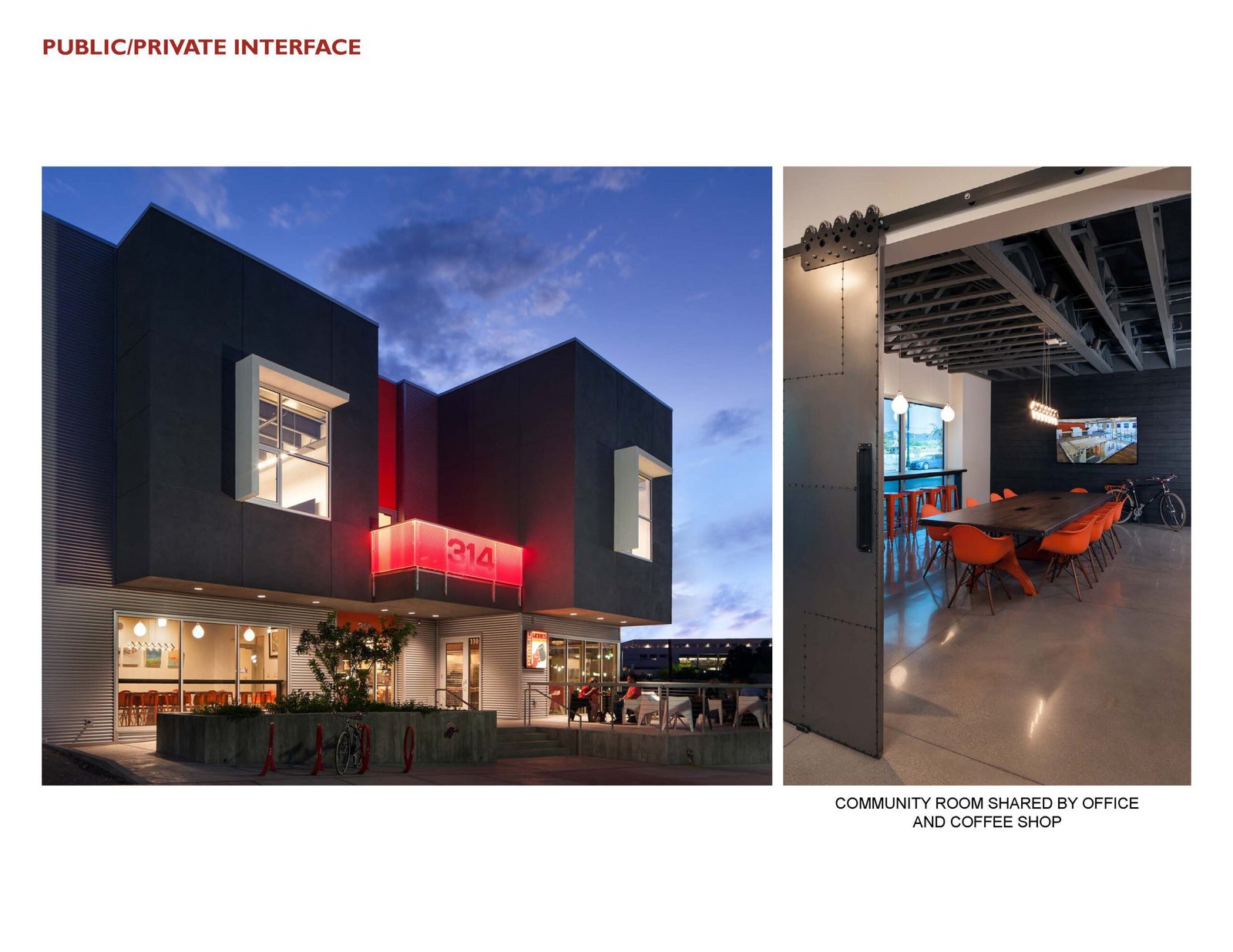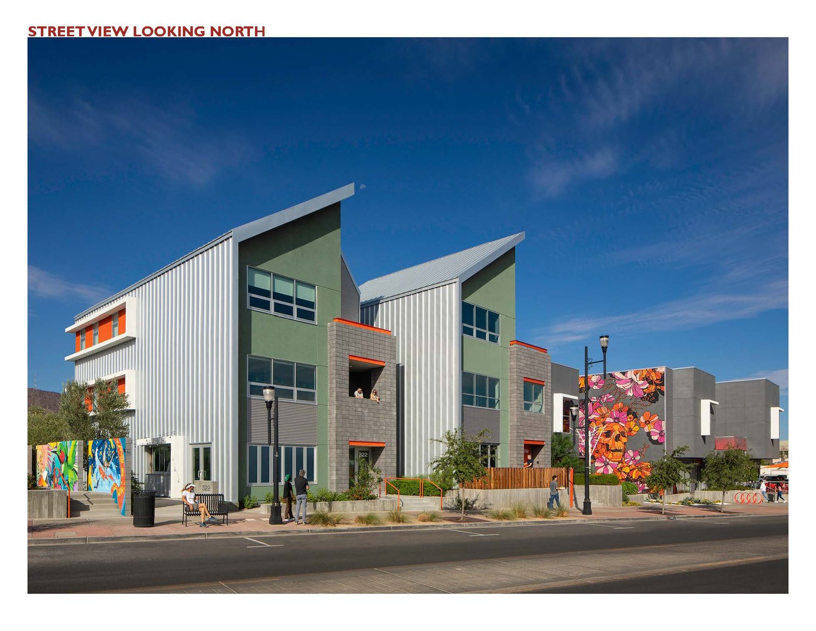 The project phasing occurred over 5-years due to the developer’s incremental financing based on multiple city grants and land acquisitions. The commercial building is 11,000sf and 2-stories. It addresses the street with massing that provides a direct connection for the coffee shop and allows pedestrians to see activity within the building. The architecture is modern and human scaled to fit within the neighborhood. The materials are straight forward, utilizing finishes common to the region. The building massing is stepped to appear as two separate structures to reduce scale from the street and provide a forecourt in front of the offices that allow viewing of the two-story mural on the south façade. It also allows the flexibility to provide for future reorganization of the office and retail mix based on market demands.