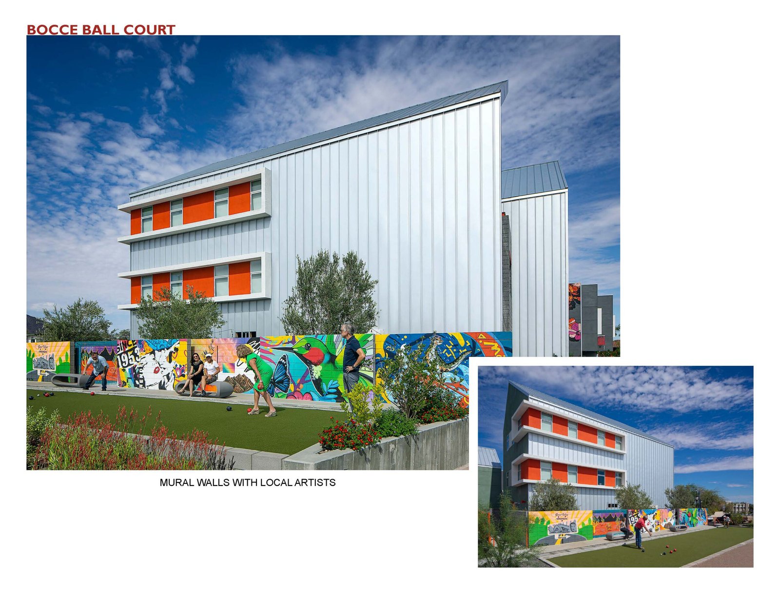 The landscaping is all comprised of drought tolerant plants and utilizes drip irrigation. Bicycle racks are provided in front on the sidewalk and there are complimentary bicycles provided for the apartment resident’s use. In addition, a bocce ball court was built to give a usable space back to the community and to encourage social activity. Public transit is accessible nearby. The objective of the overall design is to help create a walkable community.