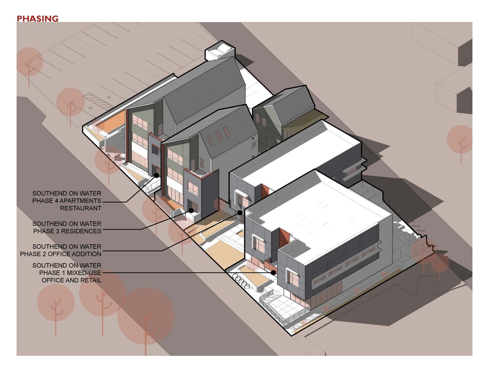 Southend on Water is a multi-phased, mixed-use urban infill redevelopment in downtown Henderson, Nevada. It is part of the historic core of the city in the Water Street District. The genesis for this development was born out of a visioning charrette held by the City of Henderson to focus on redevelopment and revitalization of their downtown area. The architecture firm who helped facilitate the process determined that they would be an ideal candidate business for relocating downtown. This helped to kick start the initial phase of Southend on Water, which has an architecture office and a coffee shop in a 2-story mixed-use building. Utilizing the existing redevelopment grants available, the developer was able to build a project that provided office space and retail creating a spark that has resulted in a wave of redevelopment downtown. Over the course of the next 5-years, constructed in four phases, the Southend development has now grown to include multi-family apartments, single-family housing, an Italian restaurant, additional professional office space, and a bocce ball court.