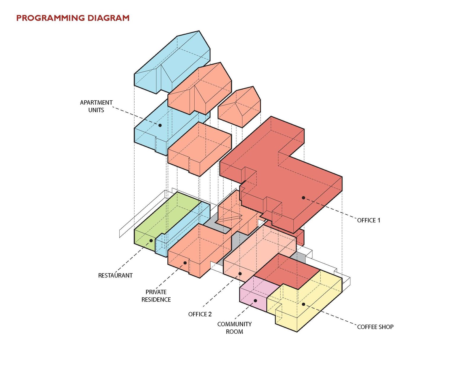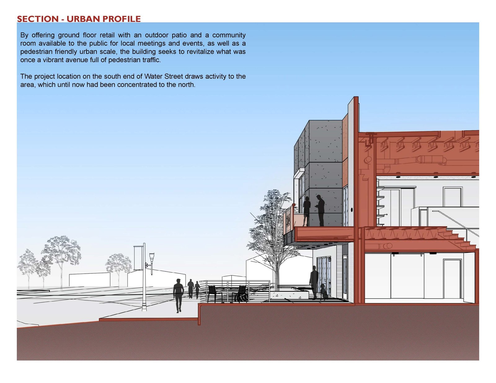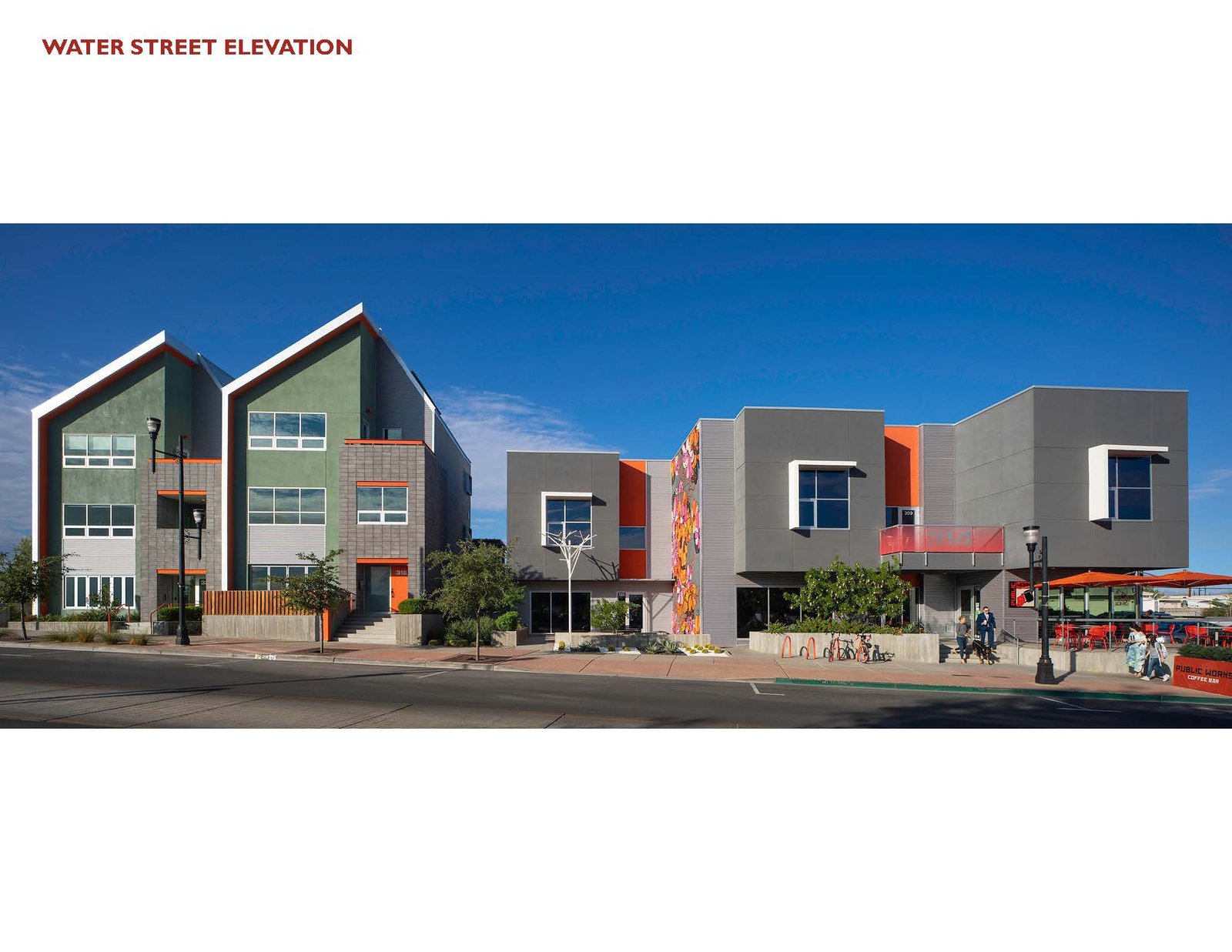 The 3,600sf three-story residential structures share an identical profile from the street and were influenced by Dutch housing typologies. One structure is a single family home with an ADU over the garage, which is separated by a courtyard and connected by a second floor bridge. It is elevated from the sidewalk and provides a usable set of stairs for seating during public events. The second residential structure is a mixed-use building with the Italian restaurant on the ground floor and an adjacent courtyard for exterior dining. The courtyard is enclosed by a set of offset walls that feature local artist’s murals facing the bocce ball court. Above the restaurant are three apartments with balconies facing Water Street. All of the structures share a common palette of materials and colors that integrate the overall design. Over the last 5 years Southend on Water has become an important catalyst for the city and for developers to invest into the downtown core.