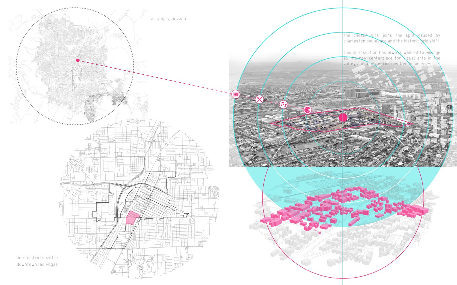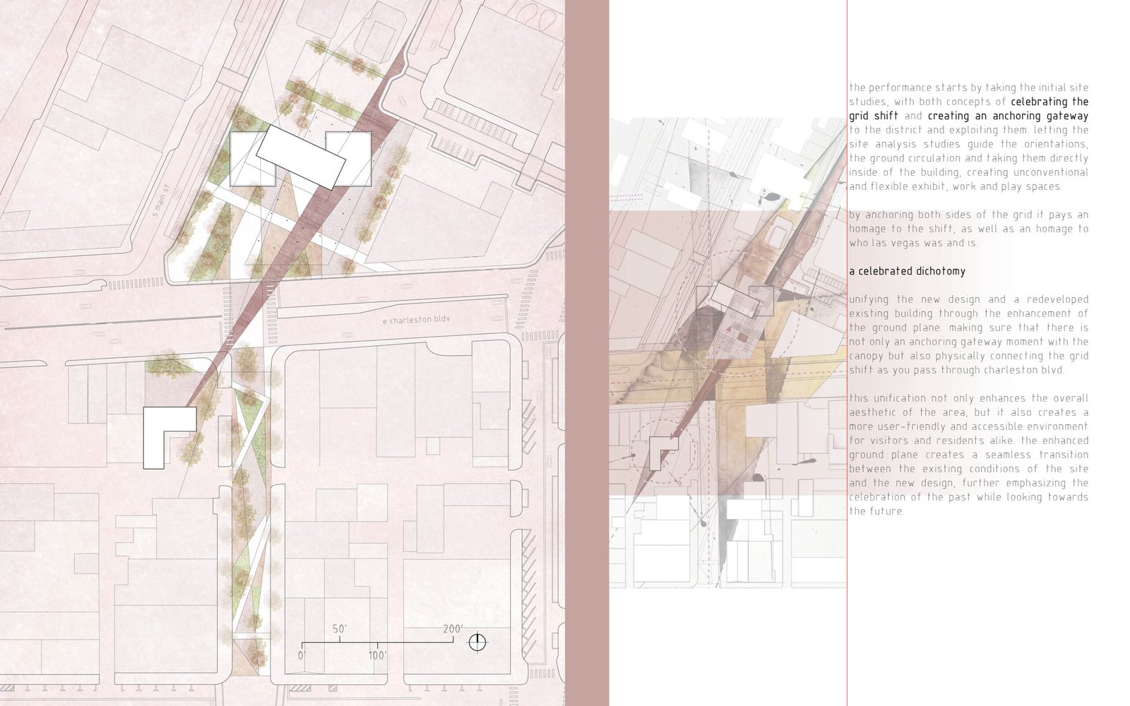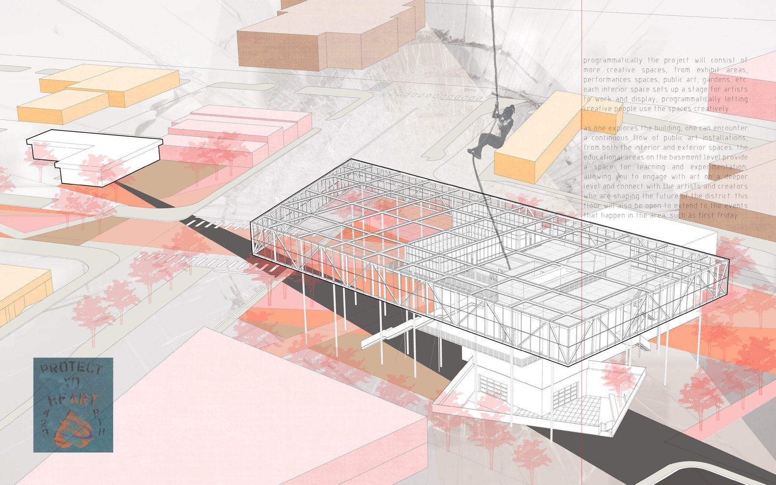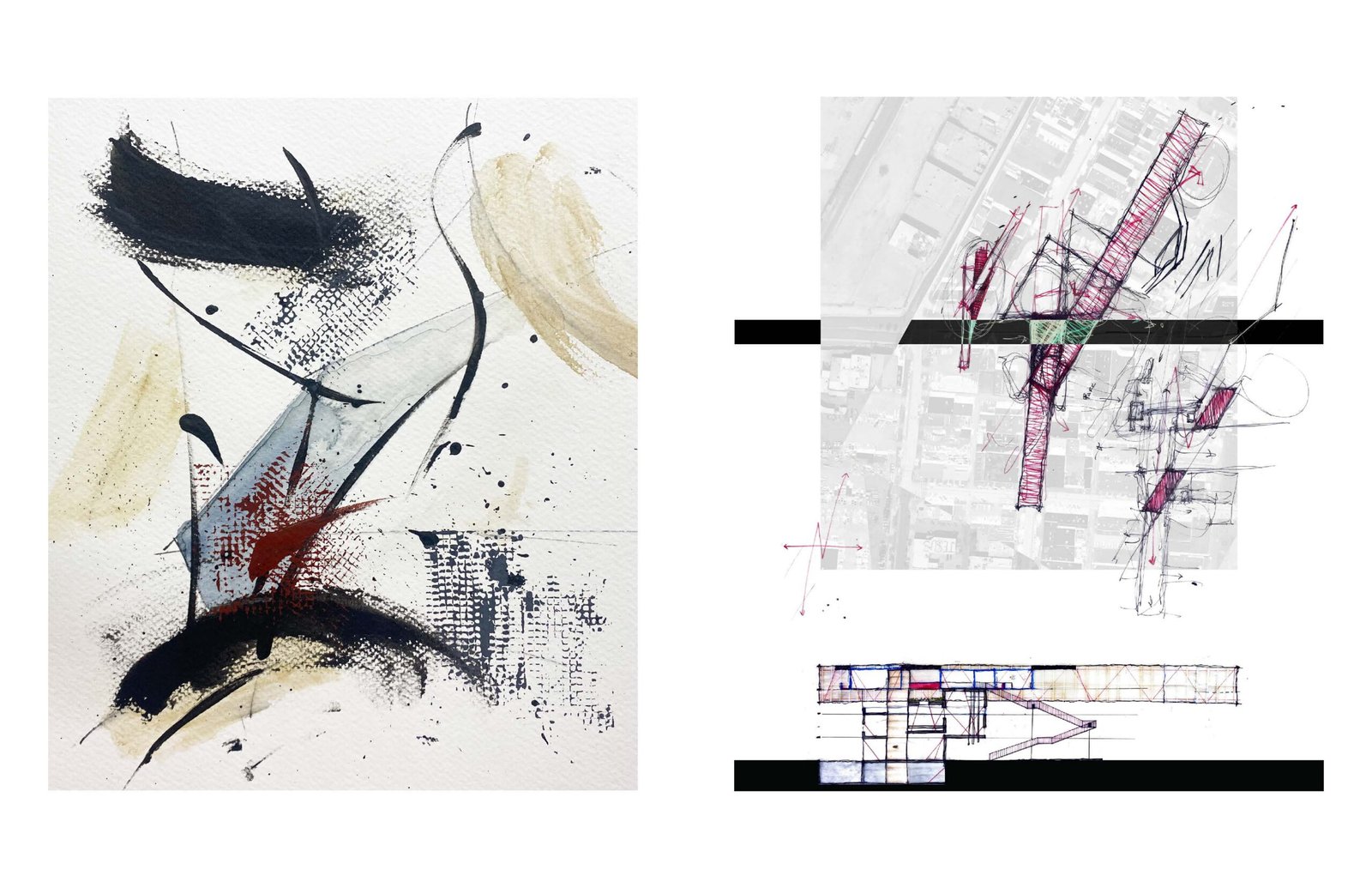 Utilizing the central area of the Arts District as a starting point, a series of sketches were created, exploring the site and context. Studying the unique features and thinking about how placement, orientation and alignments can be exploded and celebrated.