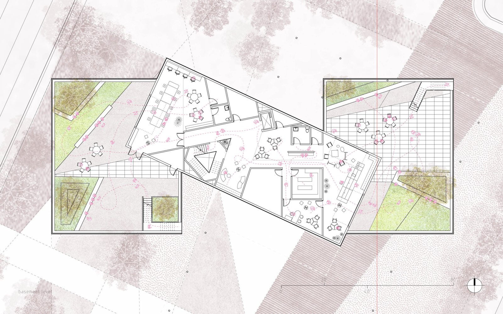 Today, the diagonal grid remains a defining characteristic of the city's urban form and development, and the city's railway history is still visible in its built environment. Celebrating the grid shift became an anchoring element for the project.