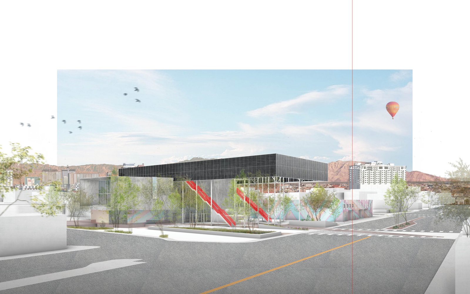 Durable materials like board formed concrete and blackened steel will withstand the Vegas heat and age gracefully. The bold red stairs provide a striking contrast to the natural surroundings, enhancing the visual impact of the project.