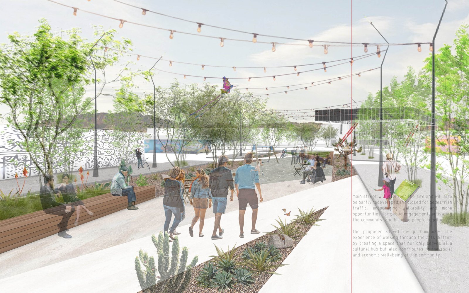 The elevated anchoring structure/canopy guides the overall design. It does a playful dance between the sun and itself. This structure becomes a celebration of our climate, as we acknowledge it, appreciate it and most importantly, compromise with it, and within that compromise life takes form. The proposal includes allowing the public to walk beneath the canopy, creating shaded plazas for various events like festivals, concerts, markets, protests, and art installations