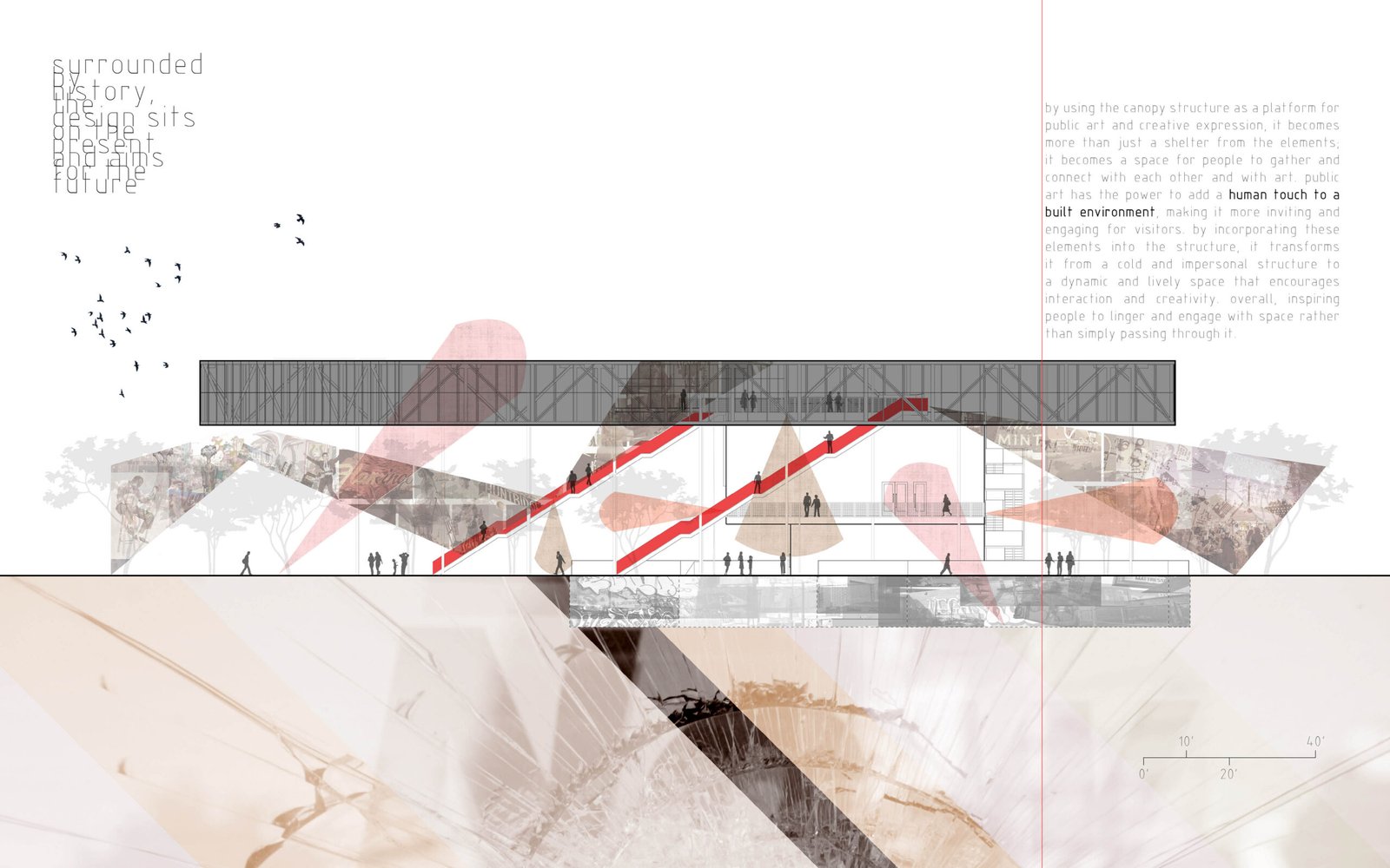 By using the canopy structure as a platform for public art and creative expression, it becomes more than just a shelter from the elements; it becomes a space for people to gather and connect with each other and with art.Public art adds a human touch to the environment, making it more inviting and engaging. This transformation turns the structure from cold and impersonal to dynamic and lively, encouraging interaction and creativity. It inspires people to linger and engage with the space, rather than just passing through.