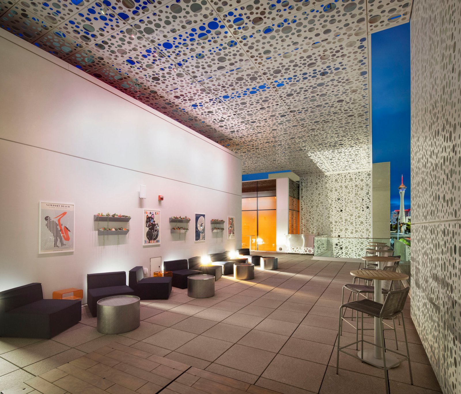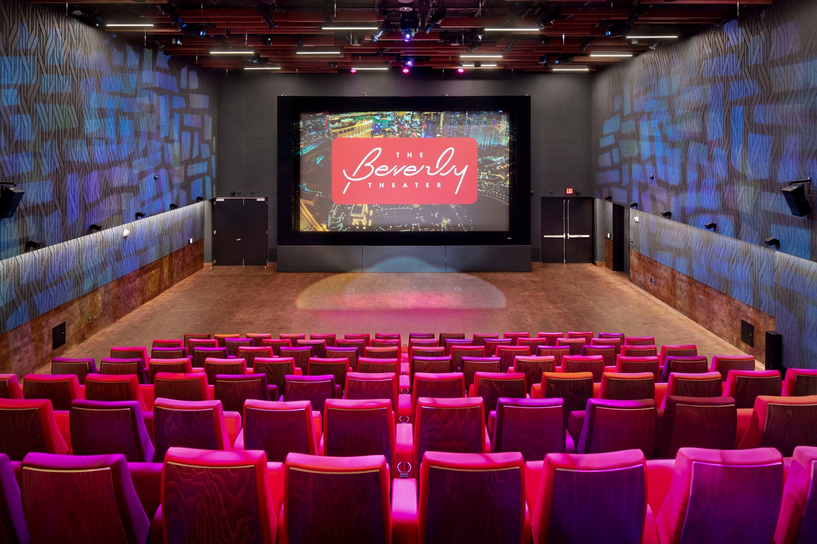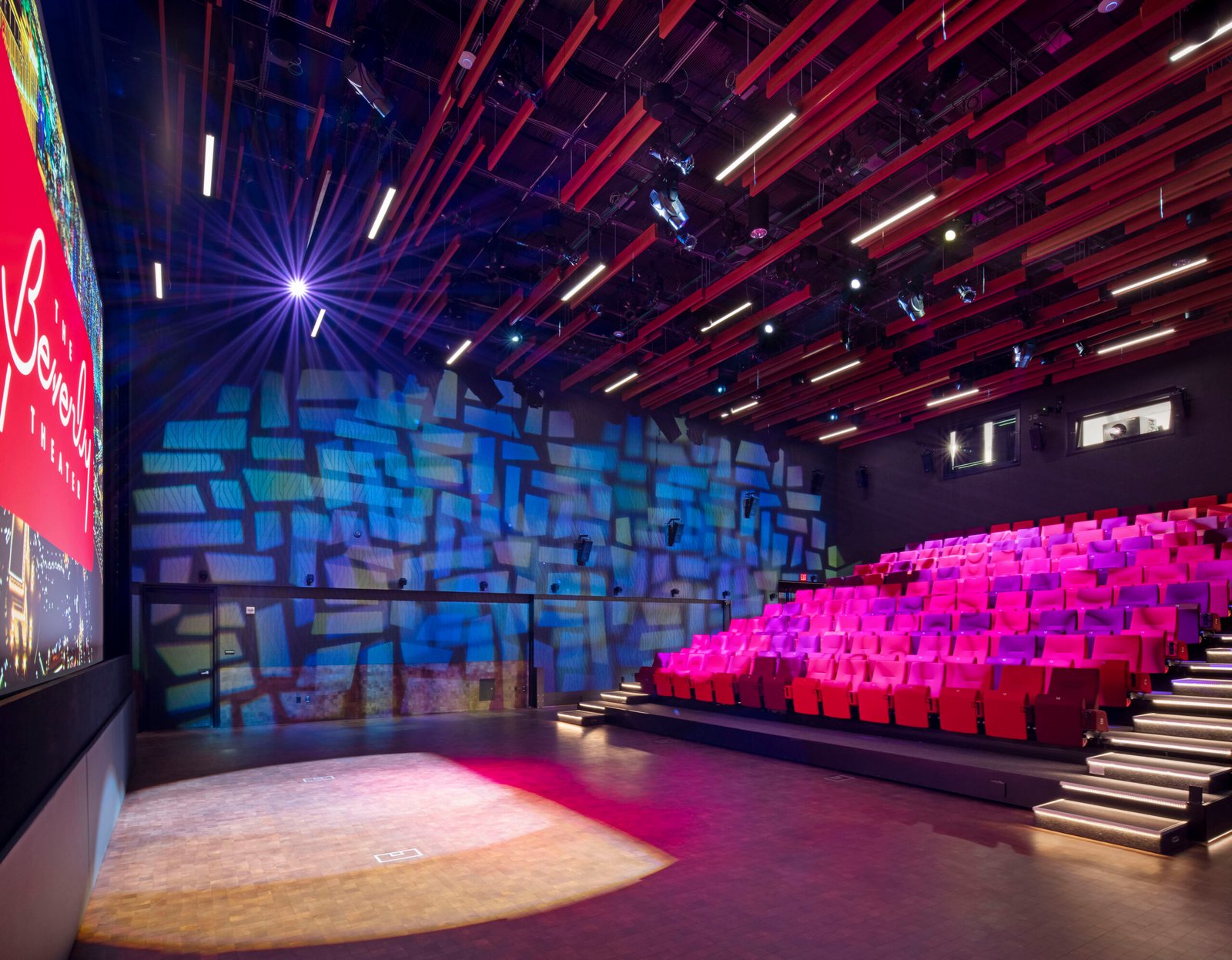 As Las Vegas’ first and only independent film house, live music venue, and storytelling arena, The Beverly Theater is synonymous with innovation. Its design is purposeful to ensure that it exceeds industry standards whether it be hosting a cinematic experience, a live concert, or an author panel event. A fully retractable seating system allows the Theater box to become a fully flexible venue. Additionally, a movable glazed wall system blends indoor and outdoor spaces, allowing performances from the theater to expand into the adjacent courtyard. Central to the design is the advanced audio-visual technology. The Beverly Theater features a custom audio experience with a platform that integrates high-quality loudspeakers, microphones, digital processing, patented algorithms, and proprietary certification techniques in a flexible package. This enables The Beverly Theater to transform its architectural acoustics with a finger tap, affording incomparable sonic flexibility. Intense and careful detailing and coordination during the design and building process by the Design Team was imperative for the above sound transformation and performance. The Experience- Upon arrival, the carefully planned desert landscape and black porcelain wall announces the entrance to a special place. Once the oversized wood pivot door opens, the visitor is surprised by the visual layering of the space. An entire lobby wall retracts and connects the interior space with the courtyard beyond. The courtyard allows for not only visual connection but also becomes a lively pre-function space when occupancy is maximized allowing the venue to expand. As you enter the lobby, you are greeted by a sculptural staircase that is framed by colored glass panels and up lit with warm lighting. The third step detailed in wood becomes part of a large platform that wraps along the outside of the staircase and serves as a bench for seating. This is a unique theater lobby space. Visitors can immerse themselves in a book as they wait, meet a director, or be part of a book signing. Once at the second level, the visitor feels a powerful and ever-changing display of light and shadow. They have arrived at the Terrace “Segue.” “A segue is a seamless transition from one scene to another, and it’s exactly what this design represents.” Kip Kelly, Creative Director, Rogers Foundation. It was important for the Rogers Foundation to have guests be able to have an opportunity to connect without the pressure of purchasing a movie ticket. Segue features a bar, fireside seating, city views, live music performances, as well as literary programming. From the lobby without a ticket to the movies, guests can experience the art gallery or immerse themselves at the “Segue”. “Segue” is art. A custom perforated metal panel system completes the composition embracing outdoor spaces connecting the terrace to the lower courtyard. Color is integrated along the exterior glazing, allowing for light and color to spill at the interior lobby. While at night, when lit, the staircase becomes a glowing iconic element. The building becomes ART.