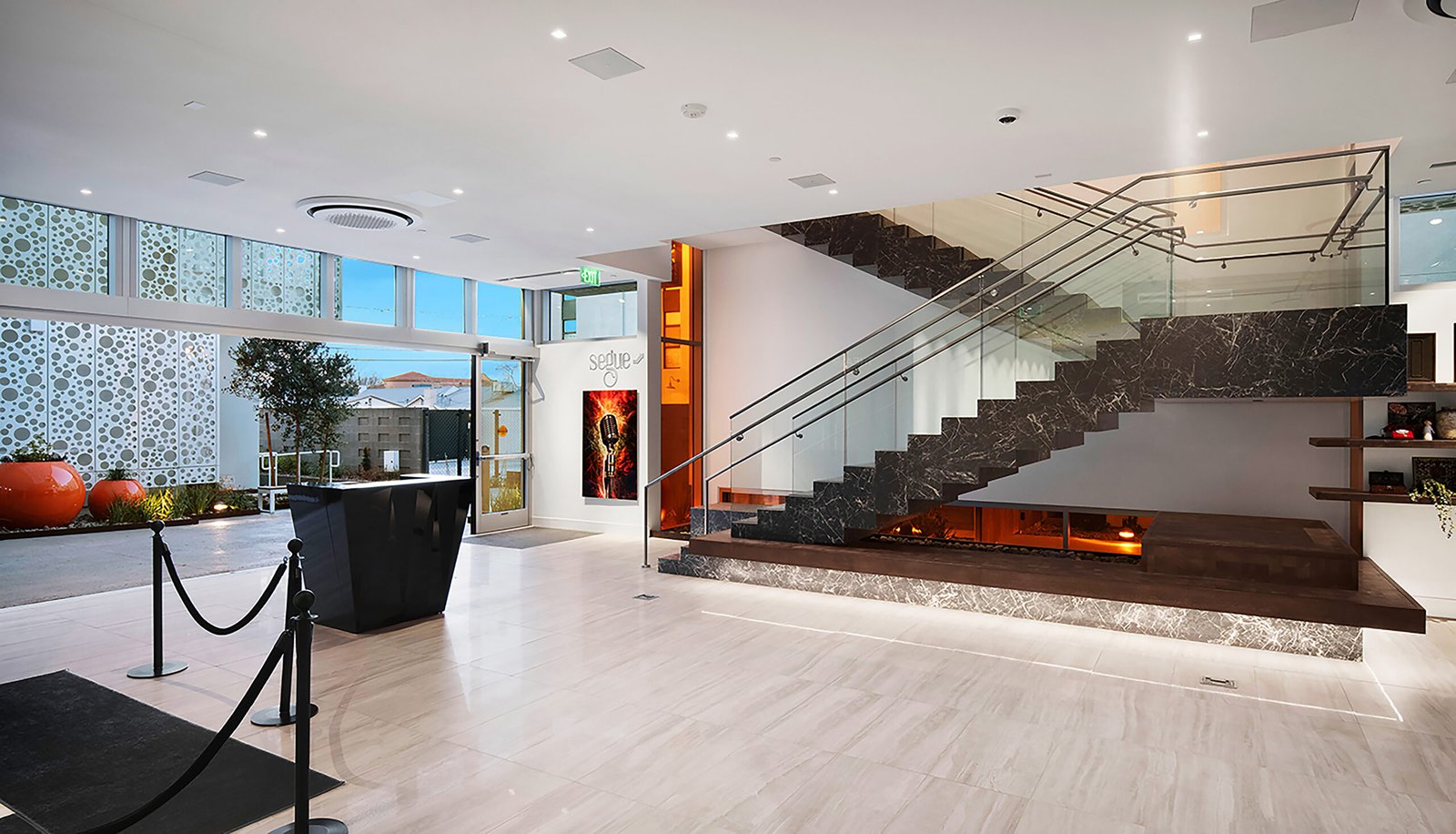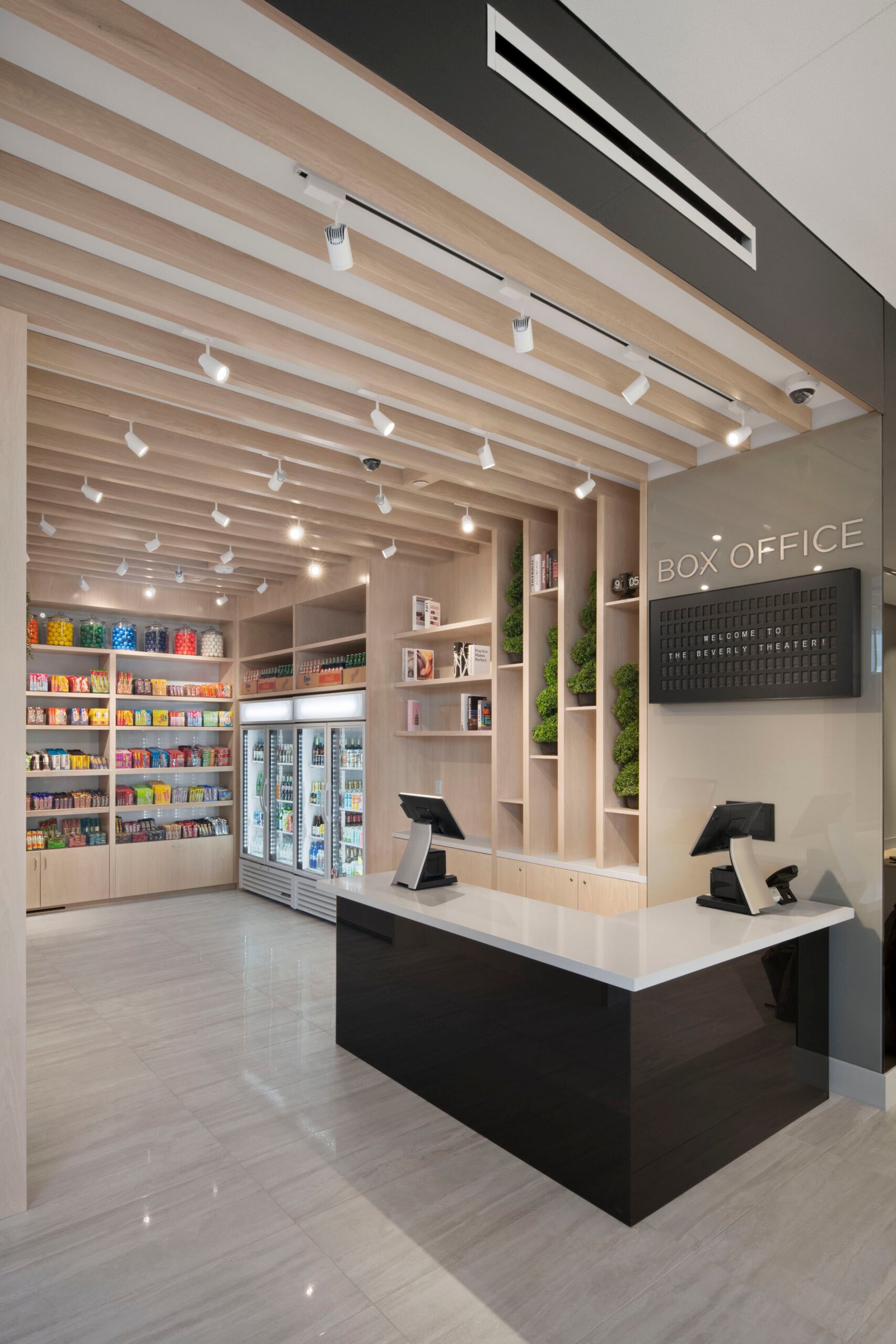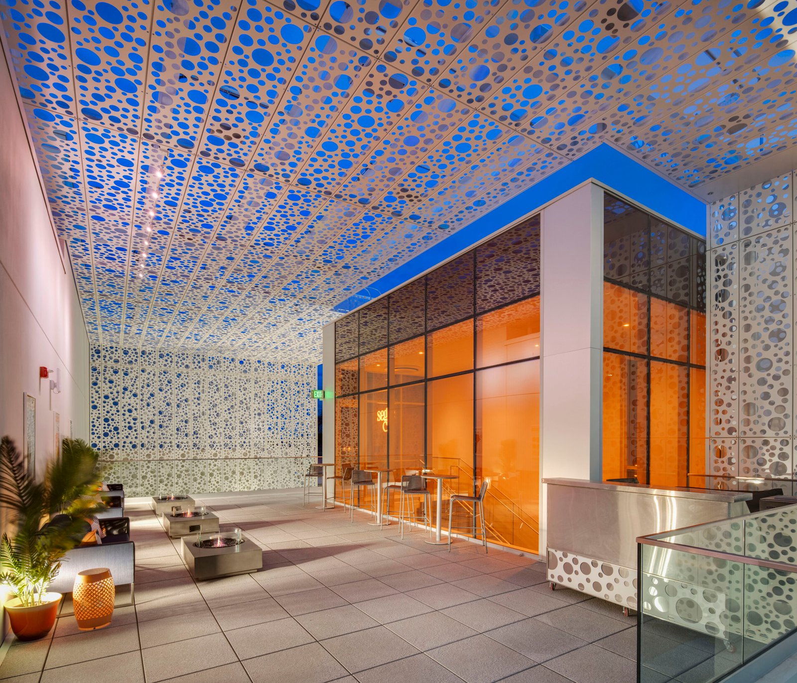 As Las Vegas’ first and only independent film house, live music venue, and storytelling arena, The Beverly Theater is synonymous with innovation. Its design is purposeful to ensure that it exceeds industry standards whether it be hosting a cinematic experience, a live concert, or an author panel event. A fully retractable seating system allows the Theater box to become a fully flexible venue. Additionally, a movable glazed wall system blends indoor and outdoor spaces, allowing performances from the theater to expand into the adjacent courtyard. Central to the design is the advanced audio-visual technology. The Beverly Theater features a custom audio experience with a platform that integrates high-quality loudspeakers, microphones, digital processing, patented algorithms, and proprietary certification techniques in a flexible package. This enables The Beverly Theater to transform its architectural acoustics with a finger tap, affording incomparable sonic flexibility. Intense and careful detailing and coordination during the design and building process by the Design Team was imperative for the above sound transformation and performance. The Experience- Upon arrival, the carefully planned desert landscape and black porcelain wall announces the entrance to a special place. Once the oversized wood pivot door opens, the visitor is surprised by the visual layering of the space. An entire lobby wall retracts and connects the interior space with the courtyard beyond. The courtyard allows for not only visual connection but also becomes a lively pre-function space when occupancy is maximized allowing the venue to expand. As you enter the lobby, you are greeted by a sculptural staircase that is framed by colored glass panels and up lit with warm lighting. The third step detailed in wood becomes part of a large platform that wraps along the outside of the staircase and serves as a bench for seating. This is a unique theater lobby space. Visitors can immerse themselves in a book as they wait, meet a director, or be part of a book signing. Once at the second level, the visitor feels a powerful and ever-changing display of light and shadow. They have arrived at the Terrace “Segue.” “A segue is a seamless transition from one scene to another, and it’s exactly what this design represents.” Kip Kelly, Creative Director, Rogers Foundation. It was important for the Rogers Foundation to have guests be able to have an opportunity to connect without the pressure of purchasing a movie ticket. Segue features a bar, fireside seating, city views, live music performances, as well as literary programming. From the lobby without a ticket to the movies, guests can experience the art gallery or immerse themselves at the “Segue”. “Segue” is art. A custom perforated metal panel system completes the composition embracing outdoor spaces connecting the terrace to the lower courtyard. Color is integrated along the exterior glazing, allowing for light and color to spill at the interior lobby. While at night, when lit, the staircase becomes a glowing iconic element. The building becomes ART.