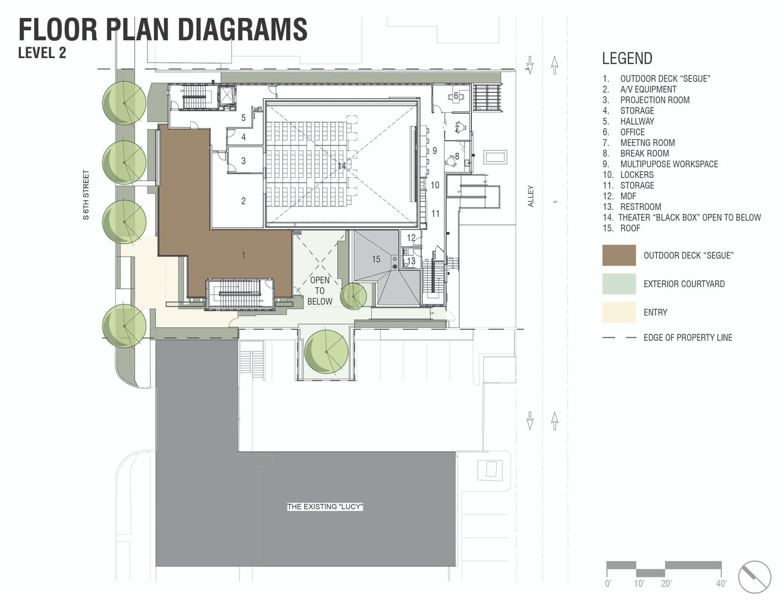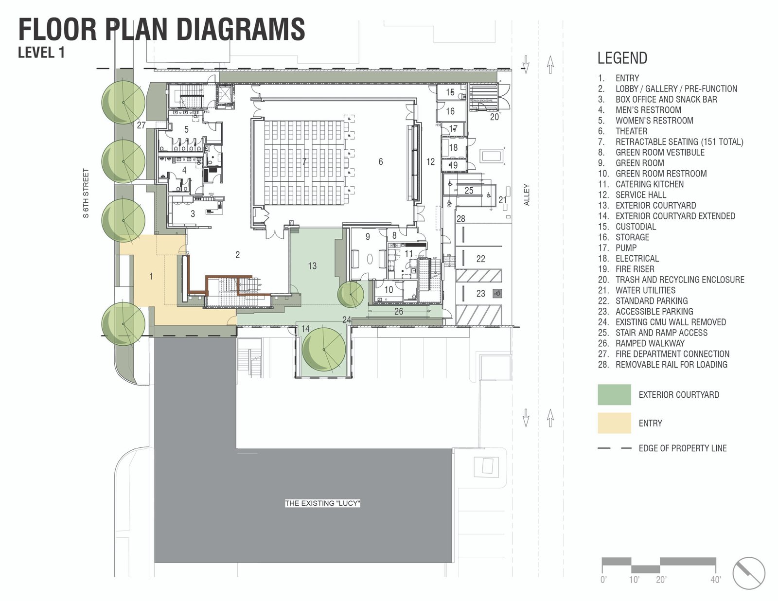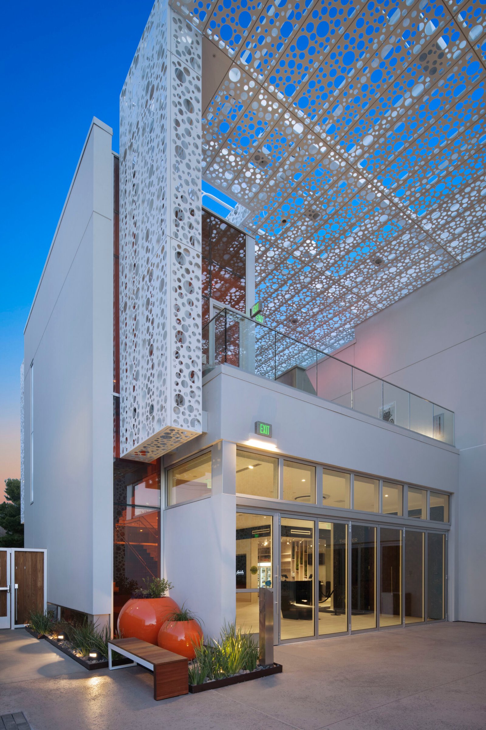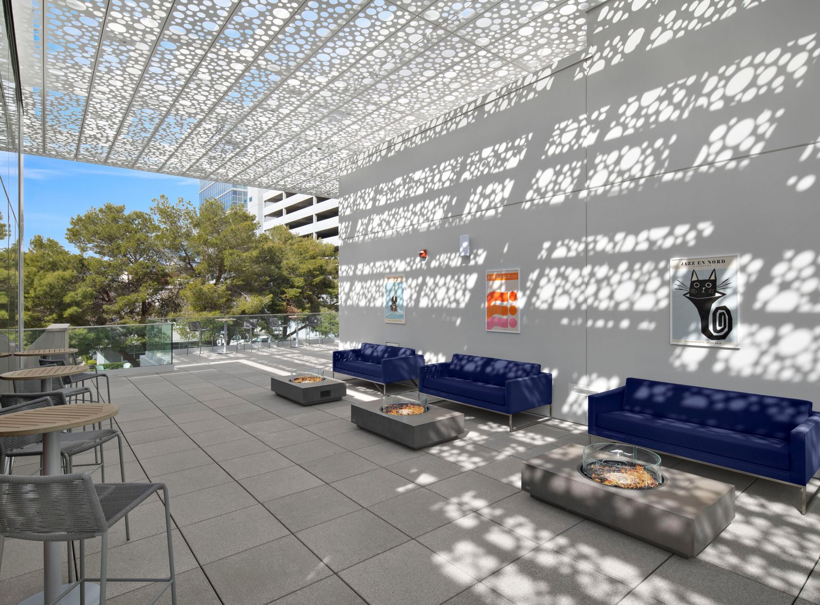Sustainable strategies include- -Reduced Parking footprint / maximized open space The Beverly Theater maximizes site utilization exceeding open space requirements for Downtown Las Vegas. Owner/city agreements for ridesharing and offsite parking in neighboring properties, allowed for a significant reduction in parking needs limited to accessible on-site parking only; reducing asphalt and parking footprint. The courtyard scheme planning allowed for the integration of a programmed space that supports not only the theater, but also the Writer’s Block next door. Furthermore, it allows for additional daylighting opportunities at the lobby and green room. -Reduced SRI materials The exterior hardscape at level one, raised pedestal pavers at the Deck, and the roof material are light in color and aggregates, supporting reduced solar reflective indexes. Furthermore, the white overall composition contributes toward low heat gain in the harsh desert climate. -Native and drought tolerant landscape blend this indoor/outdoor experience. -Natural Ventilation The courtyard pulls in cooler airflow from the breezeways and folding glass door systems and releases the heated airflow upward through the perforated canopy. The custom perforated, high-recycled-content aluminum panel system embraces the exterior event spaces - providing a canopy of shade that reduces the heat gain contributing to user’s comfort at exterior spaces.