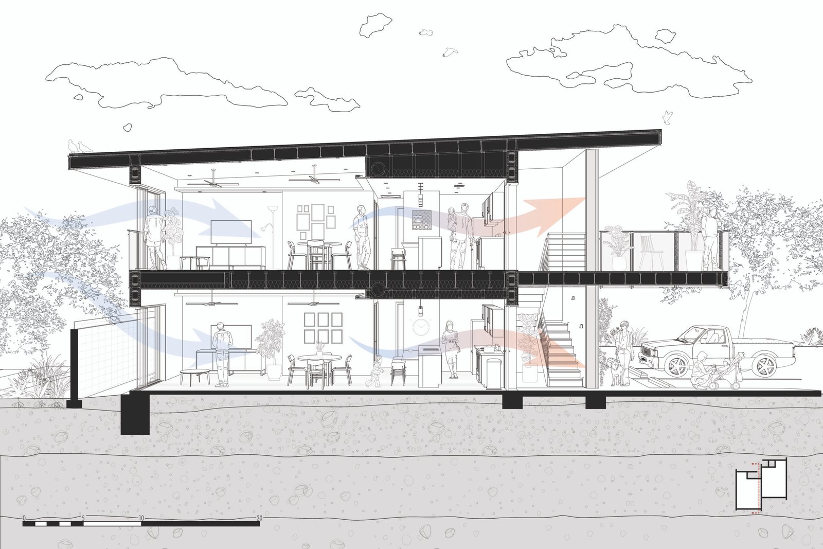 The Weston responds to the Mojave Desert by prioritizing passive cooling strategies. All of the exterior walls of the project are composed of Insulated Concrete Form (ICF) blocks to maximize energy efficiency and privacy between units. Efforts have been made to minimize material waste by utilizing the standard ICF block sizes to dictate wall heights, window locations, and wall configurations. Fenestration has been limited to the northern and southern facades to minimize energy loss during the pertinent summer months while permitting cross ventilation from the prevailing winds. The East and West-facing walls are 14” ICF, acting as thermal mass for the summer months.. Each window on the east and west facades is screened with a perforated metal screen to allow for filtered daylight and provide privacy from the streetscape. The exterior walls will be plastered in white stucco in order to maximize the albedo effect and reflect as much solar heat as possible. Large overhangs from the balconies and roofs aid in shading the south-facing windows. The roof’s area provides sufficient space to integrate photovoltaic panels and offset the residents’ energy consumption. The axial room layouts allow the users to cross-ventilate their homes as they see fit. On the second floor, the sloped ceilings provide a natural exhaust for warm air.