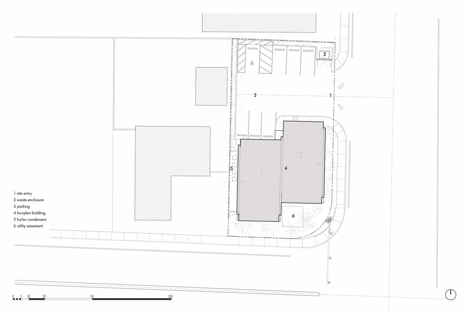 The median age of the neighborhood was in the mid-30s, with most households being 1 to 2 people. To best respond, each unit consists of 2 bedrooms, 2 bathrooms, a combined living-dining area, and a private outdoor space. Despite the lot’s limited size, we felt that access