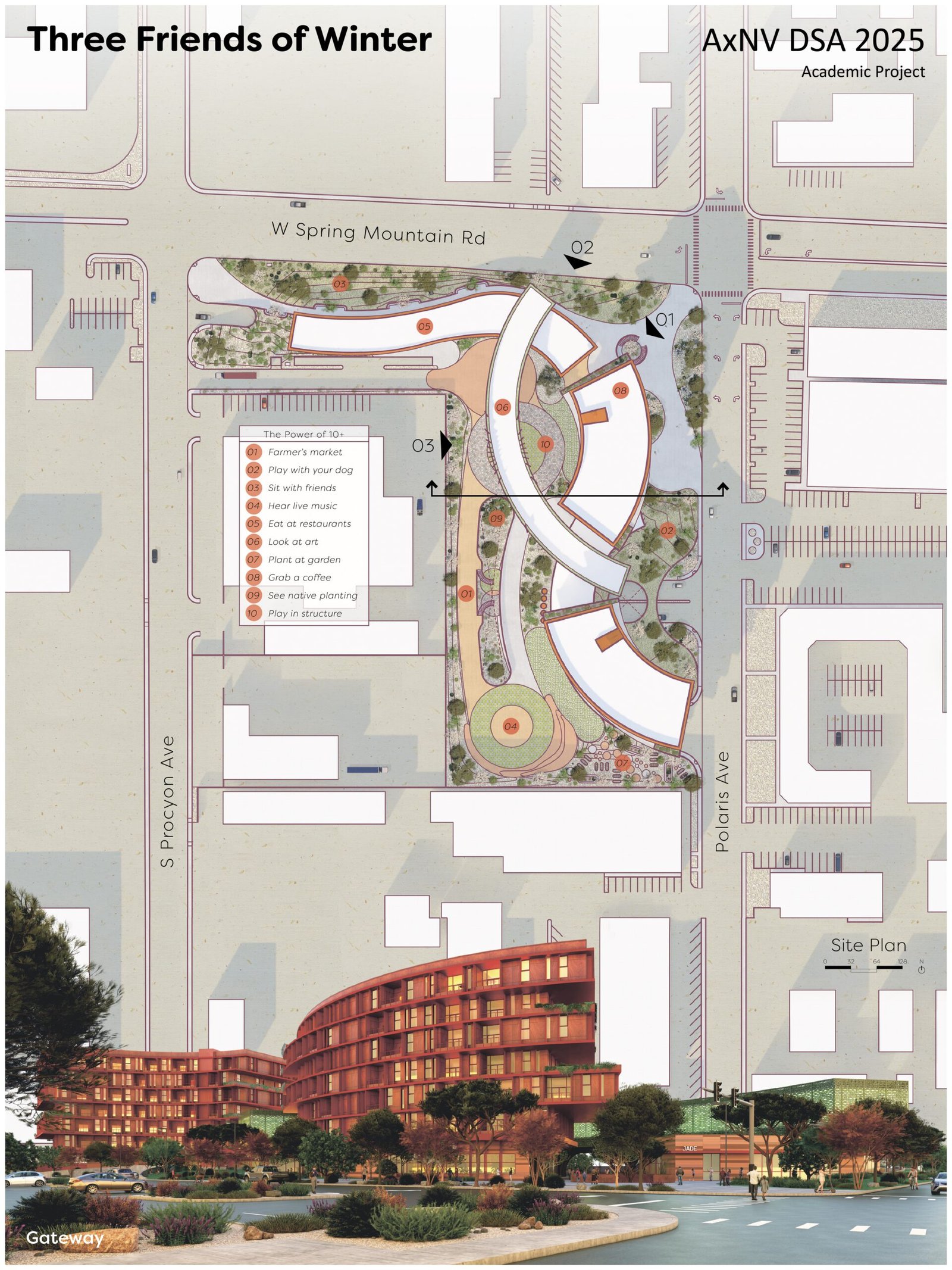 A cherished pan-Asian tale, the pine tree, bamboo, and plum blossom, symbolize resilience, unity, and perseverance. Known as the “Three Friends of Winter,” these plants endure the harshest seasons, reflecting the historical perseverance of the Asian diaspora amid systemic discrimination, forced labor, and cultural displacement. Drawing inspiration from the Three Friends, each plant informs a distinct component within this 5.5-acre, 203,000-square-foot mixed-use development. The pine, symbolizing fortitude and longevity, is reflected in the protected pedestrian plaza, a grounding space for gathering and reflection. Bamboo, known for flexibility and integrity, shapes the residential towers, rising resiliently above the plaza like a community that bends but does not break. The plum blossom, first to bloom after winter, represents hope and renewal, embodied in the cantilevered cultural center projecting toward the Spring Mountain range, offering expansive views and optimism. Connecting all three is the shared “root” system, an underground network of parking, site perforations, and bermed earth. Though unseen, these roots sustain life and continuity, guiding circulation and unifying the site. Ultimately, this project honors past strength, embraces present adaptability, and looks toward a future grounded in identity, community, and cultural resilience.