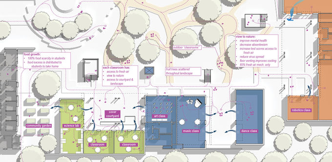 This project explores the research on the impacts of daylighting in schools. From academic performance to mental health, research has shown the positive impact daylighting can have on a student’s sense of wellbeing. Additionally, this design will examine the research on human experience established through the “greening” of campuses. The design will seek to challenge the status quo of the school district’s prototypical design, characterized by a lack of windows and concrete plazas. We will explore the emotional, mental and physical impact of building forms as we revise the institutional approach to scale, form, and material, seeking instead to create a place of connection, welcome, and sanctuary.
