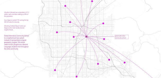 Sited along a heavy commercial street, the site forms a barrier to protect an established residential neighborhood to the east of the site. The design began in landscape, creating an enhanced public realm along the roadways while reestablishing ecological foundations. Formal (structures) and informal classrooms are scattered among a landscape which serves to return to the idea of Las Vegas as a meadow, while also providing fruit and vegetables to support the culinary lab and food limitations of the students.