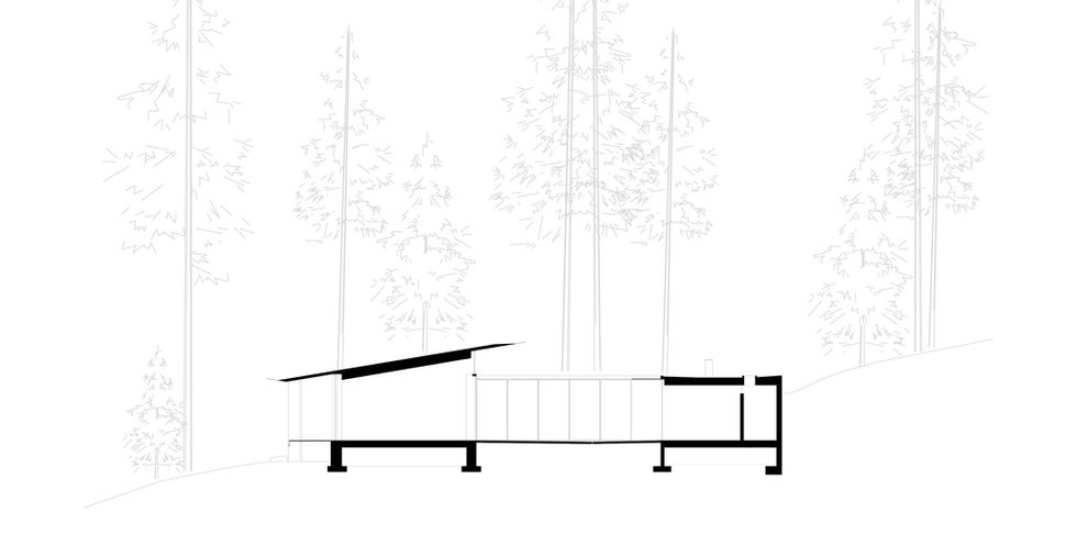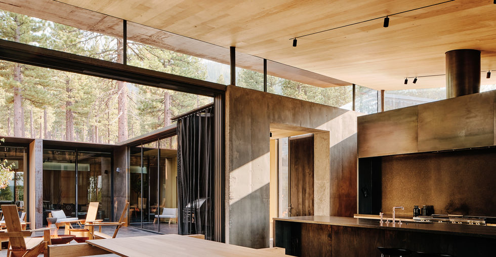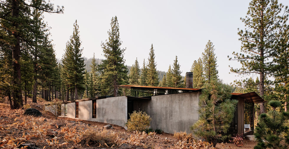 A San Francisco family with a passion for outdoor recreation reached out to us to help them expand this property near Lake Tahoe in the Sierra Nevada. Their outdoor pursuits include ice climbing, winter camping, and backcountry skiing. Located on a North facing slope, the site looks down to Martis Valley and up to the south to Lookout Mountain: an 8000’ extinct volcano seen through a natural screen of 100-year-old Jeffrey and sugar pine trees. The house reflects the clients’ love of camping and exploring. To tap into their enhanced experience of the natural landscape, a courtyard plan evolved as a formal device that connects the occupants with the natural environment. The 3,600 square foot program includes four sleeping rooms, a gathering space, garage and private outdoor space. The client describes, “It was the architect's idea to be inside and outside at the same time – which is just our thing. It’s a base camp for me and my family, where we can ski in and out.” The house digs incrementally into the slope, with sleeping areas wrapping the courtyard earning light and privacy from neighbors that surround the property. The family gathering space is a south facing concrete pavilion that connects the courtyard to the distant view beyond. A thin steel shed roof pitches up to open the interior to the southern sun and views to ski runs on the mountain. The house reflects the clients’ love of exploring the backcountry. At night, the spaces surrounding the courtyard are activated by the flickering light of the fire pit.