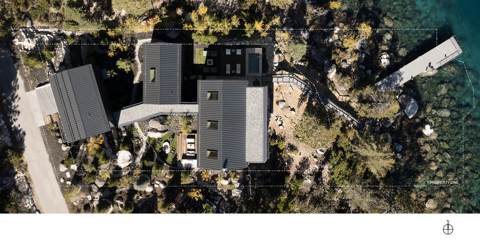 strategically arranged around the site’s elemental intricacies with distinct connections to the Tahoe landscape and lakefront below. The individual