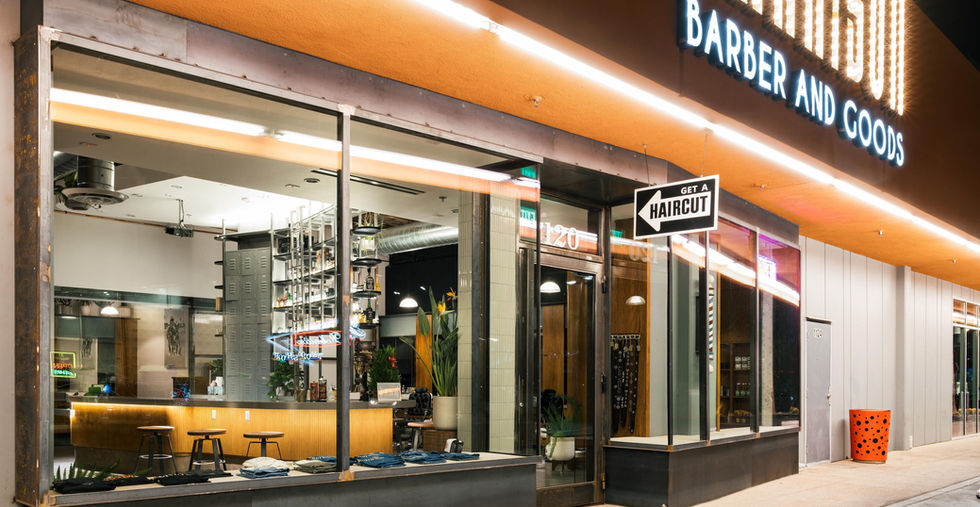 Setting the stage for a unique customer experience, The Garrison's entrance defies convention with a custom steel storefront, projecting beyond the building's exterior while providing seating and product display on the interior side. Inside, a central island 'bar' serves as a welcoming space for patrons awaiting their appointments, accompanied by an optional shoe-shine service.